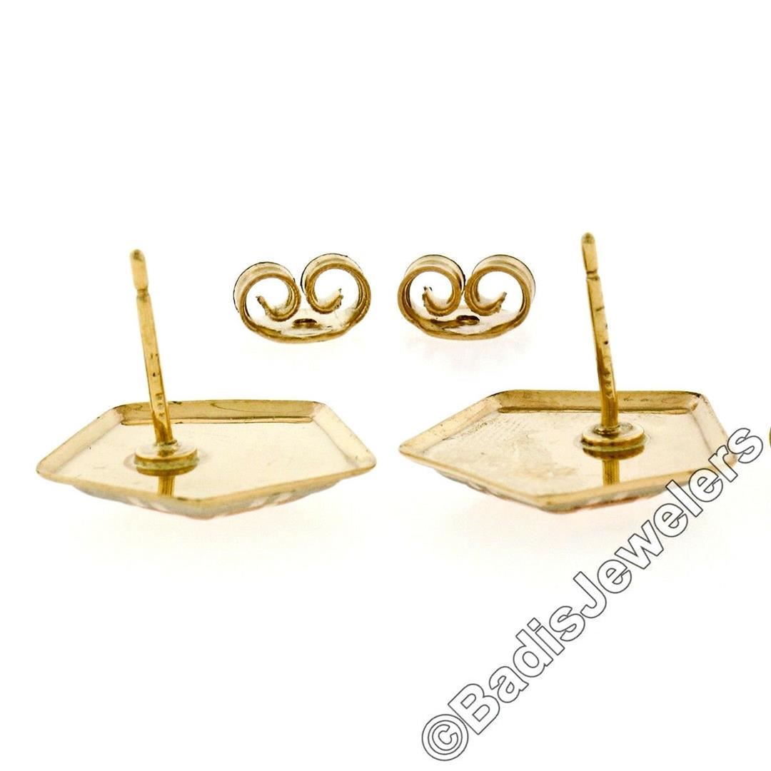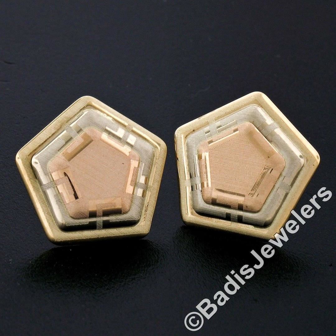 A pair of new 14kt rose, white, and yellow gold stud earrings with a stone-finished tiered pentagon design. The earrings measure approximately 16.5x15.9mm and weigh a total of 3.32 grams.