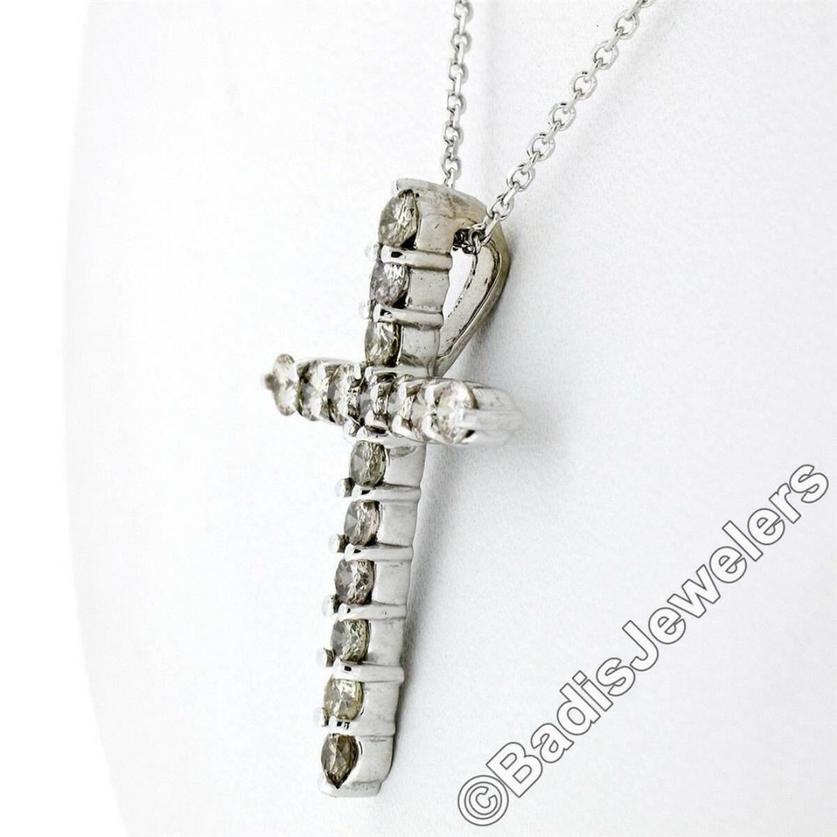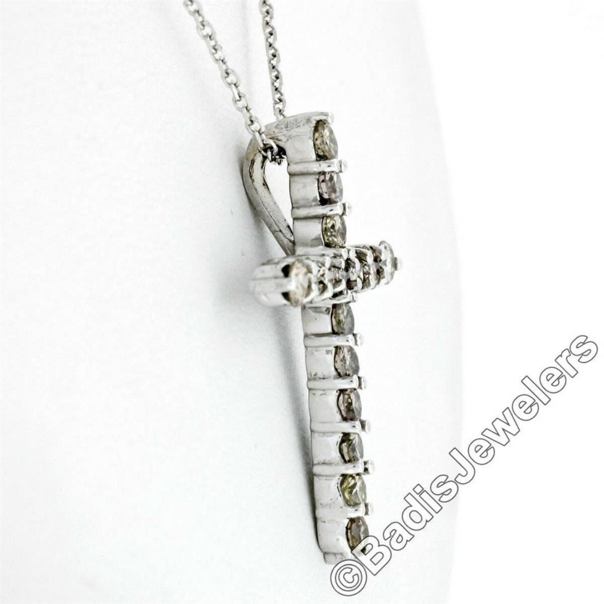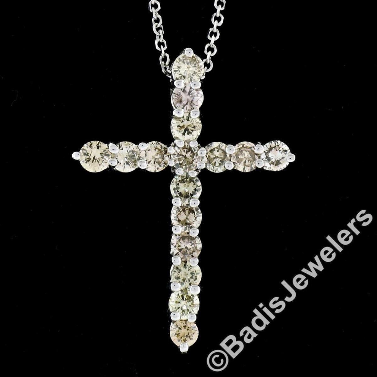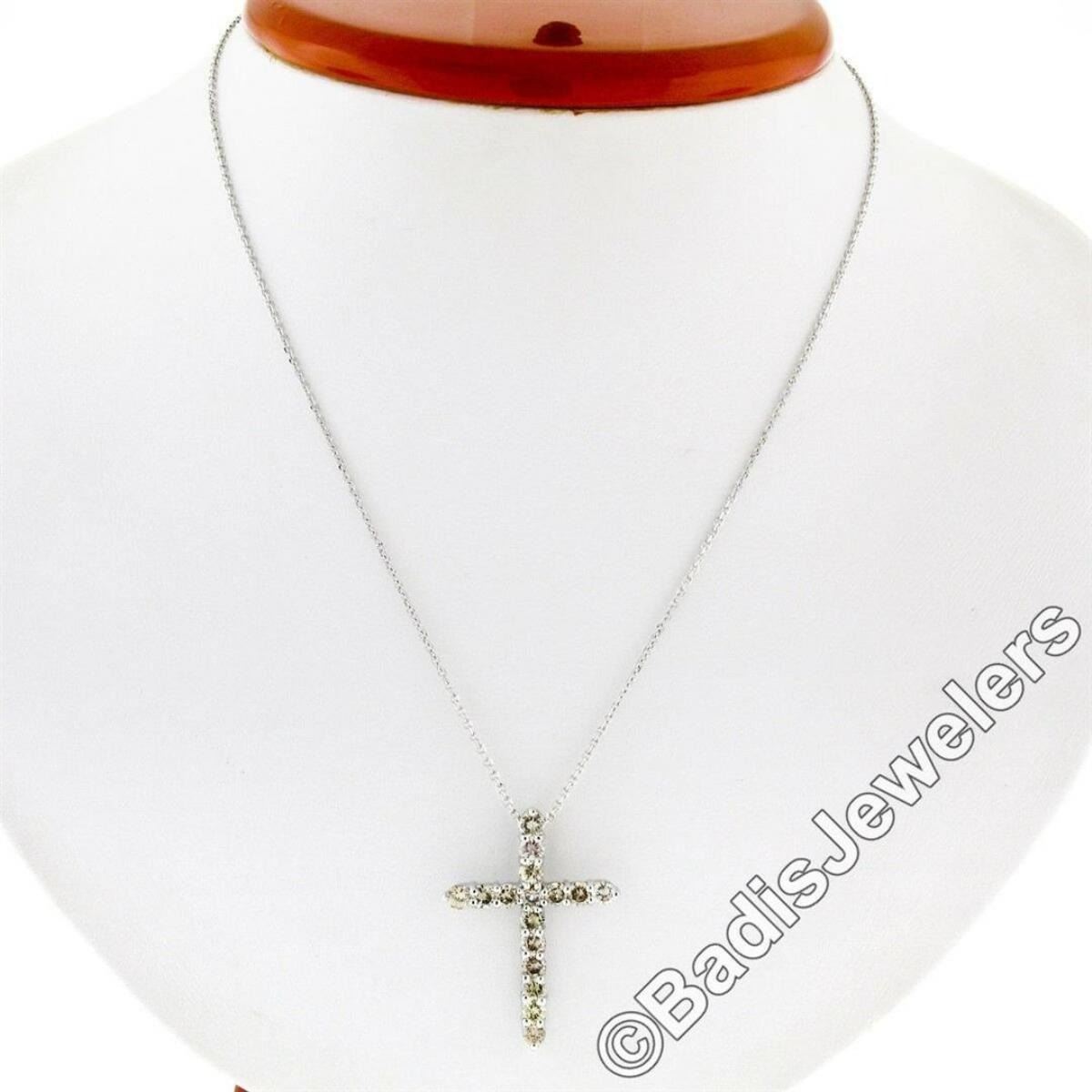 A new 14kt white gold cross pendant necklace featuring 16 round brilliant diamonds of various light fancy colors (VS1/VS2; 1.52ctw). 18 inch cable link chain, 4.35 grams total weight, pendant measures 28.25x20.60mm.
