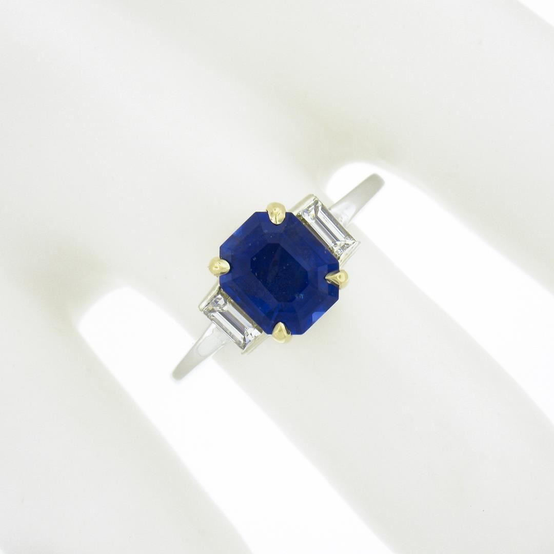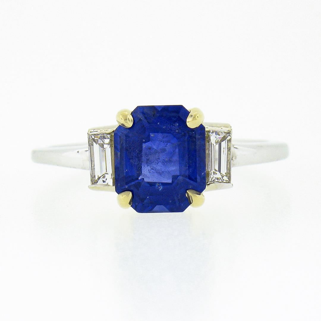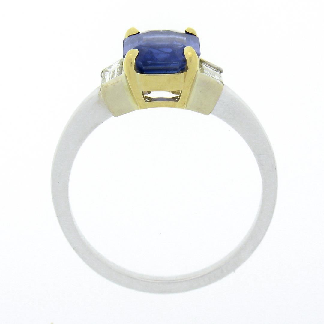 A new solid 18k white & yellow gold engagement ring, with 1 GIA graded octagonal step cut natural sapphire (2.22ct), and 2 baguette cut natural diamonds ( G/H - VS1/VS2 ; 0.39ctw). The ring is size 6.5, weighs a total of 3.56 grams, and measures 8.0mm wide. Comes with all original relevant certifications.