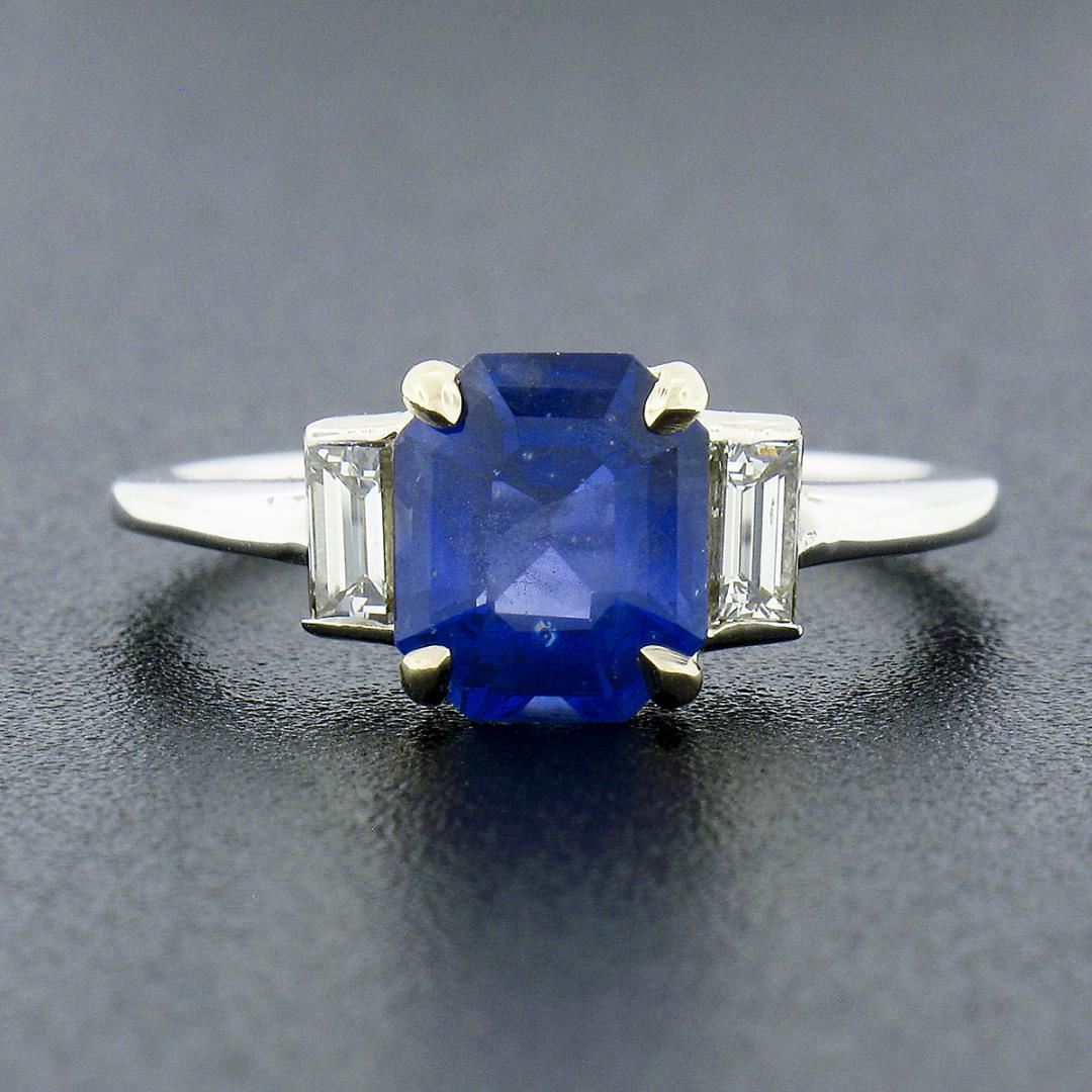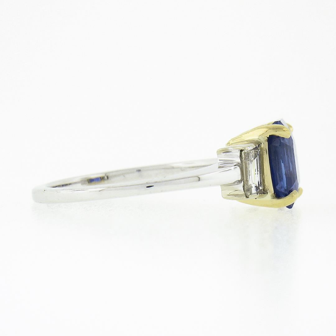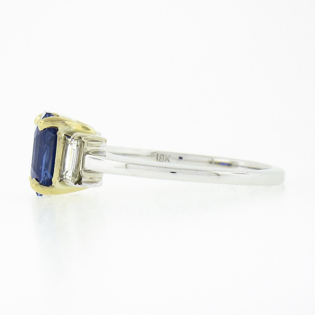 A new solid 18k white & yellow gold engagement ring, with 1 GIA graded octagonal step cut natural sapphire (2.22ct), and 2 baguette cut natural diamonds ( G/H - VS1/VS2 ; 0.39ctw). The ring is size 6.5, weighs a total of 3.56 grams, and measures 8.0mm wide. Comes with all original relevant certifications.