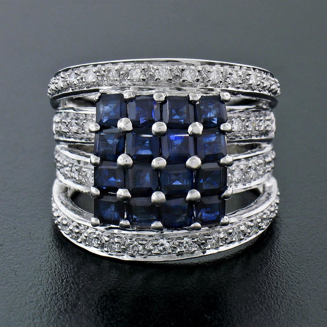 A new solid 18k whte gold square ring, with 16 round brilliant cut natural sapphires (2.50ctw), and 54 round brilliant cut natural diamonds ( F/G- VS1/VS2; 0.65ctw). The ring is size 6.5, weighs a total of 9.07 grams, and measures 17.0mm wide.