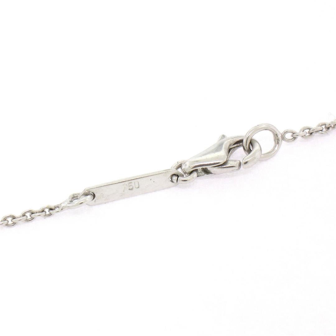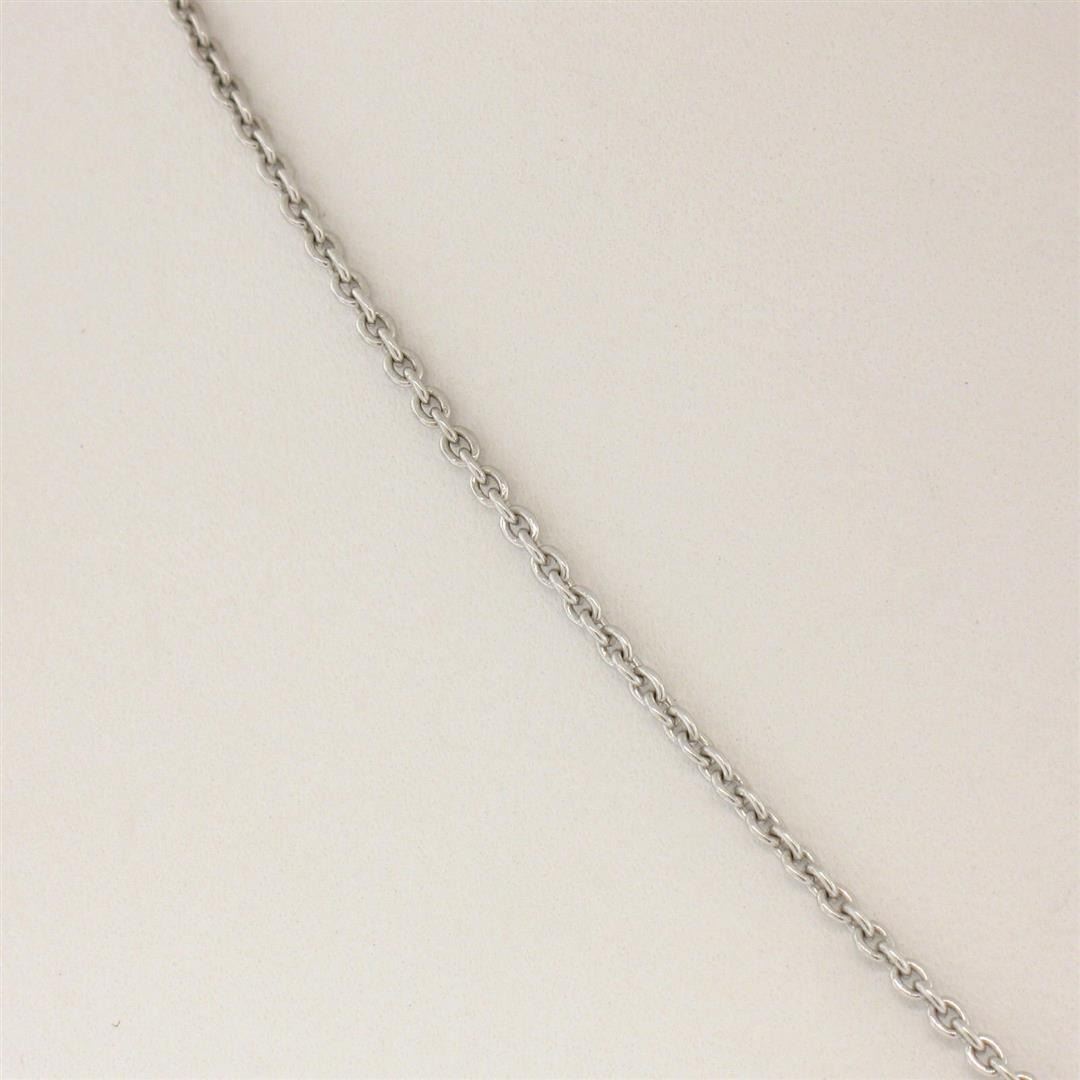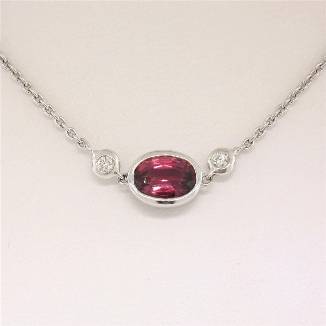 A new 18k white gold pendant necklace featuring a GIA certified 1.07ct oval pink sapphire accented by 2 round brilliant diamonds (G / VS1). 16 inch cable link chain, 4.48 grams total weight, measures 21.0x7.2mm.