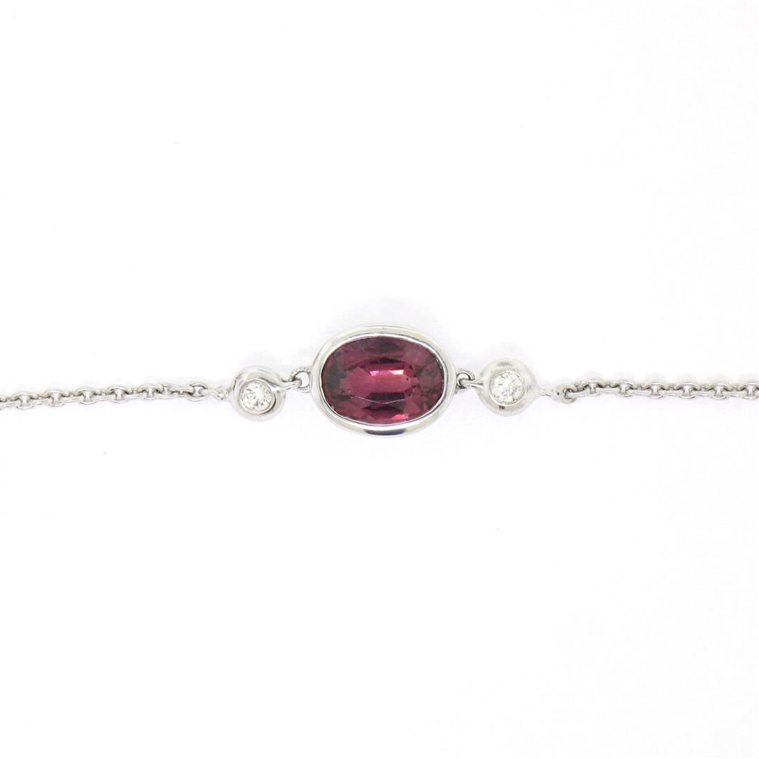 A new 18k white gold pendant necklace featuring a GIA certified 1.07ct oval pink sapphire accented by 2 round brilliant diamonds (G / VS1). 16 inch cable link chain, 4.48 grams total weight, measures 21.0x7.2mm.
