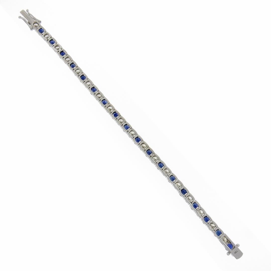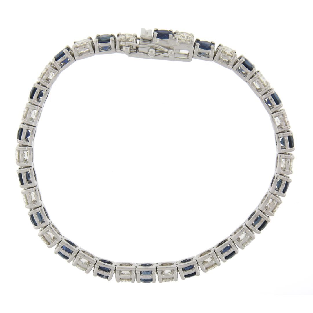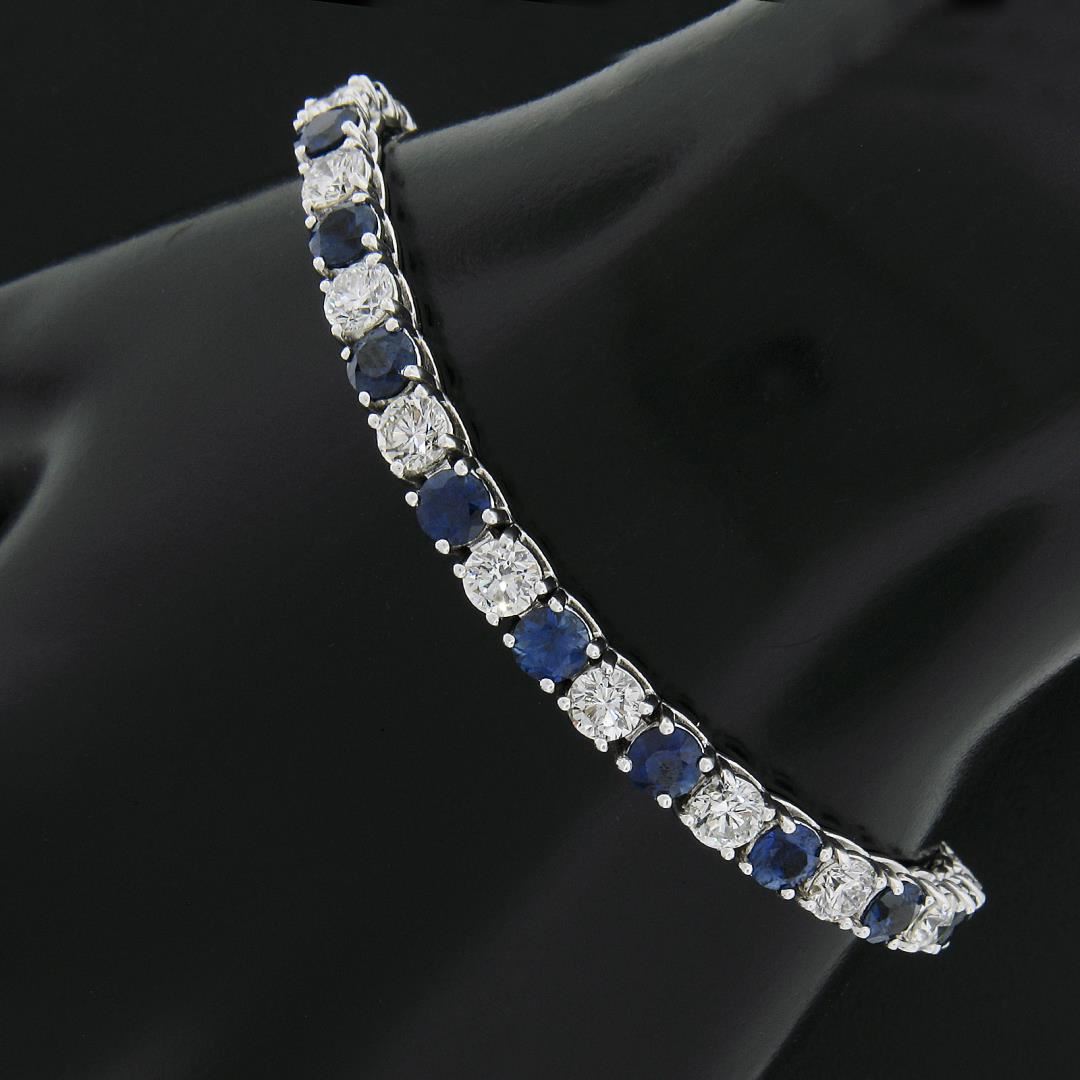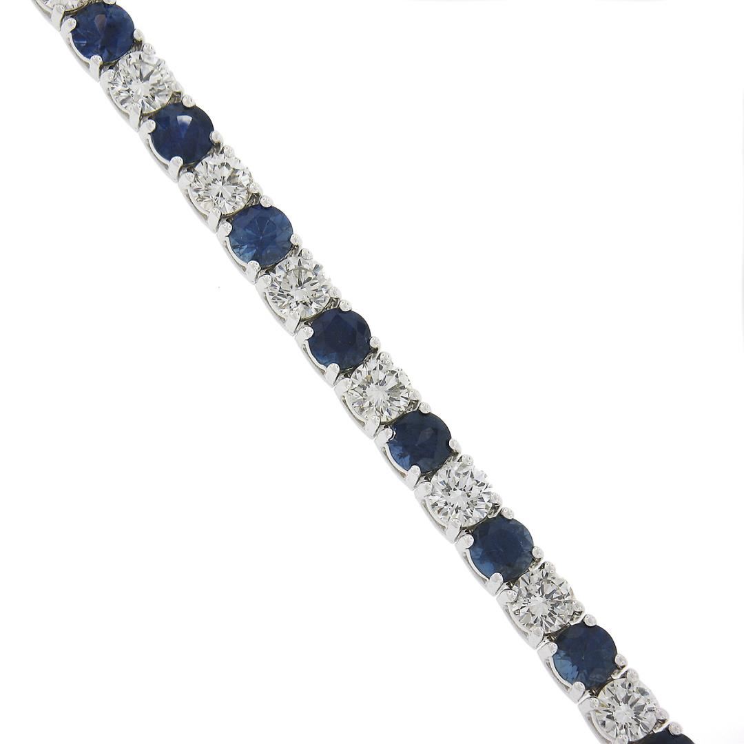 A new solid 18k white gold tennis line bracelet, with 18 round cut natural diamonds (H/I - VS2/SI1 ; 5.31ctw ), alternated with 18 round cut natural sapphires (6.95ctw). It weighs a total of 16.78 grams, measures 4.5mm wide, and measures 6.5 inches in length.