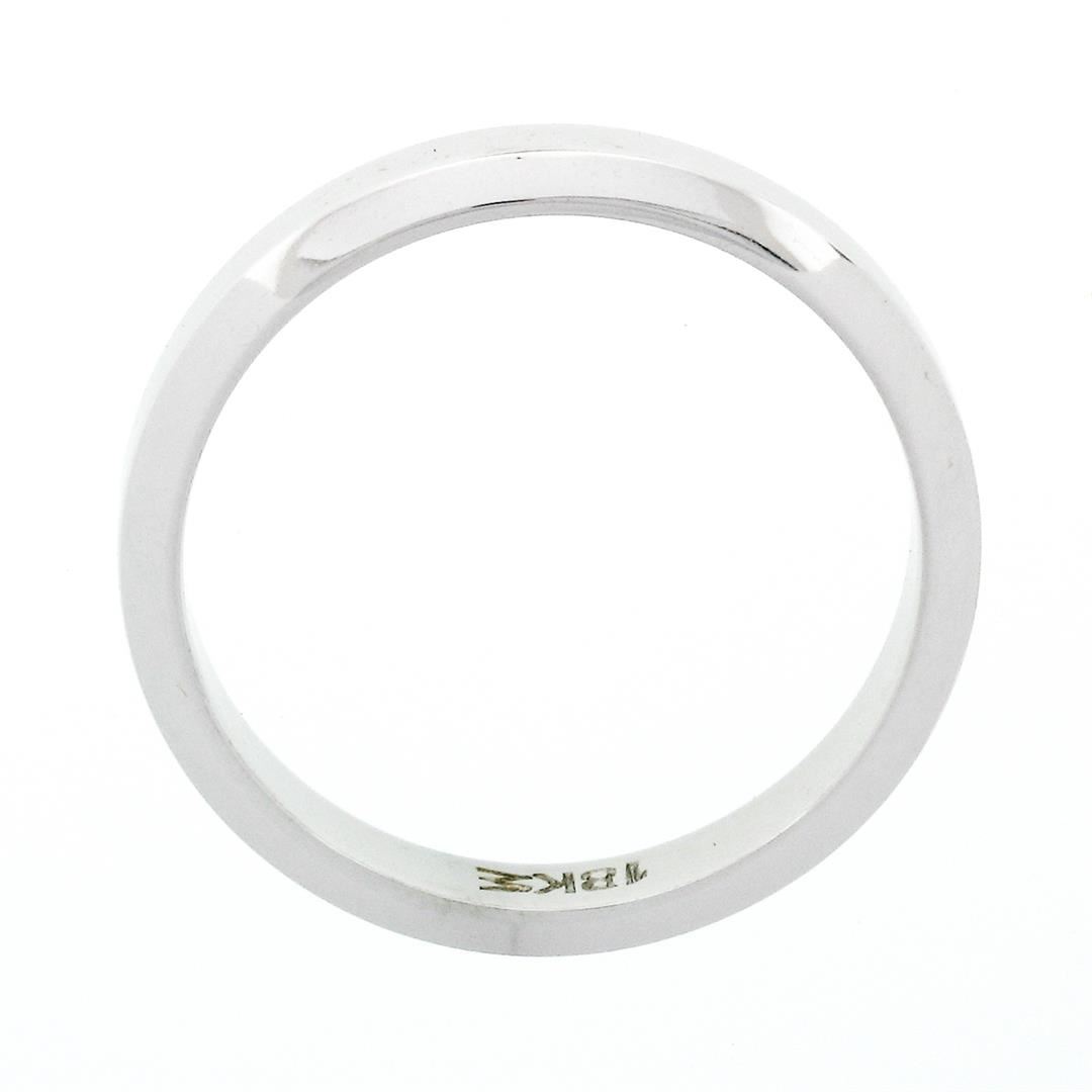 A new, solid 18k white gold, stackable squared band ring with a beveled edge.The ring is size 9.5, weighs a total of 4.84 grams, and measures 3.45mm wide.