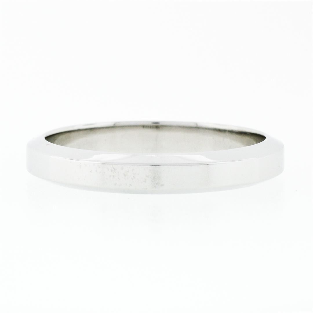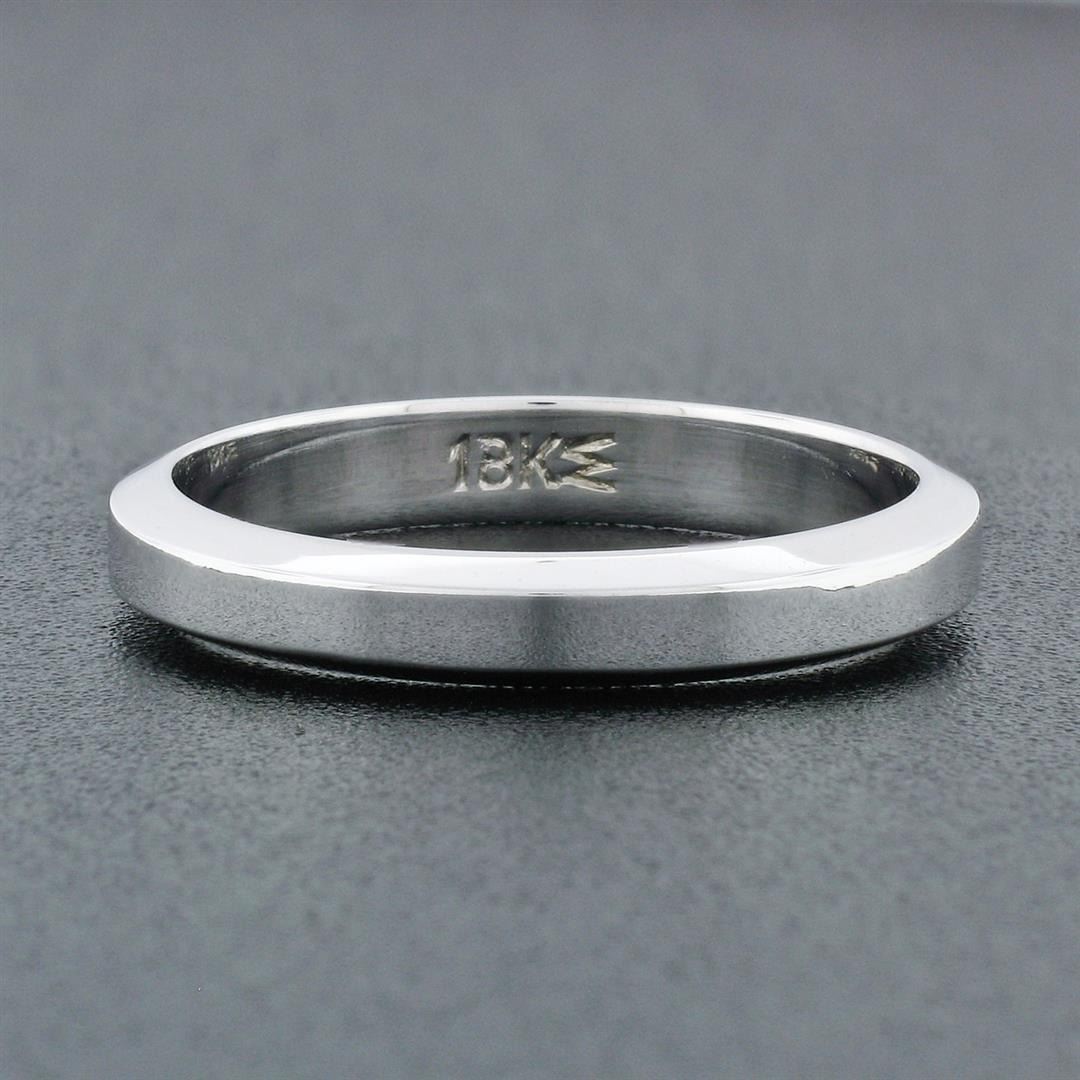 A new, solid 18k white gold, stackable squared band ring with a beveled edge.The ring is size 9.5, weighs a total of 4.84 grams, and measures 3.45mm wide.