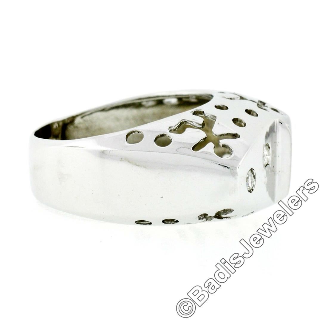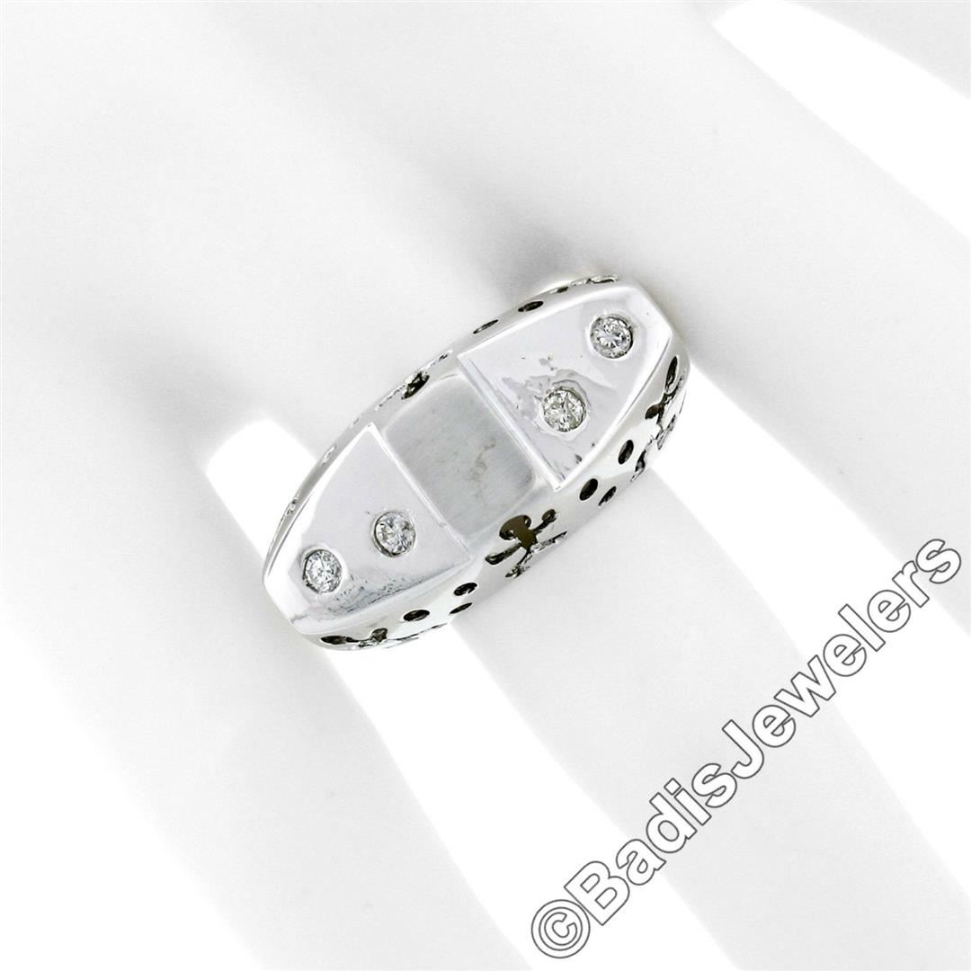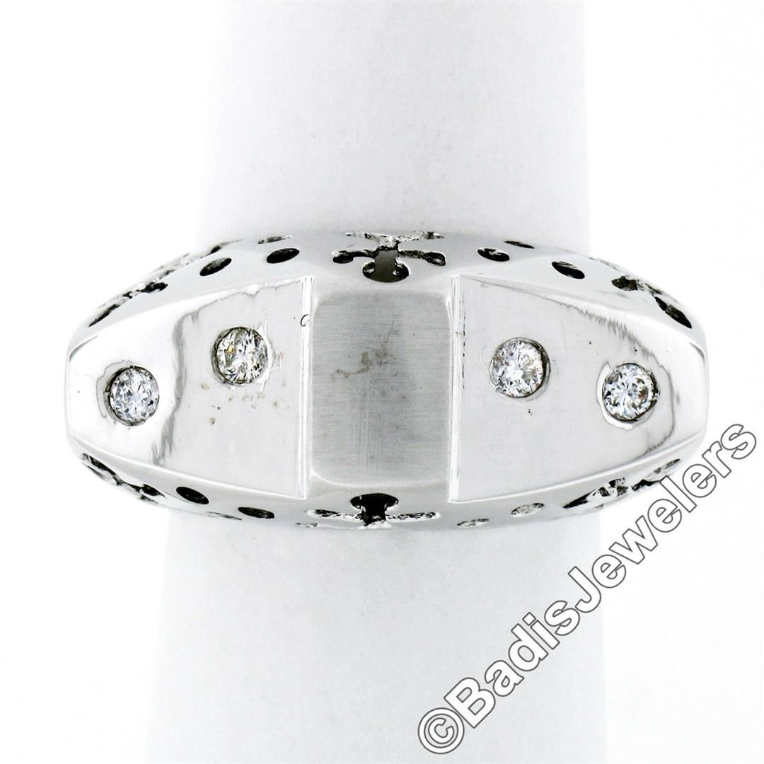 A new 18kt white gold band ring with pierced sides featuring 4 burnish set round brilliant diamonds (I - SI1; 0.16ctw). The ring is size 7.5, weighs a total of 9.30 grams, and measures 11.9mm wide.