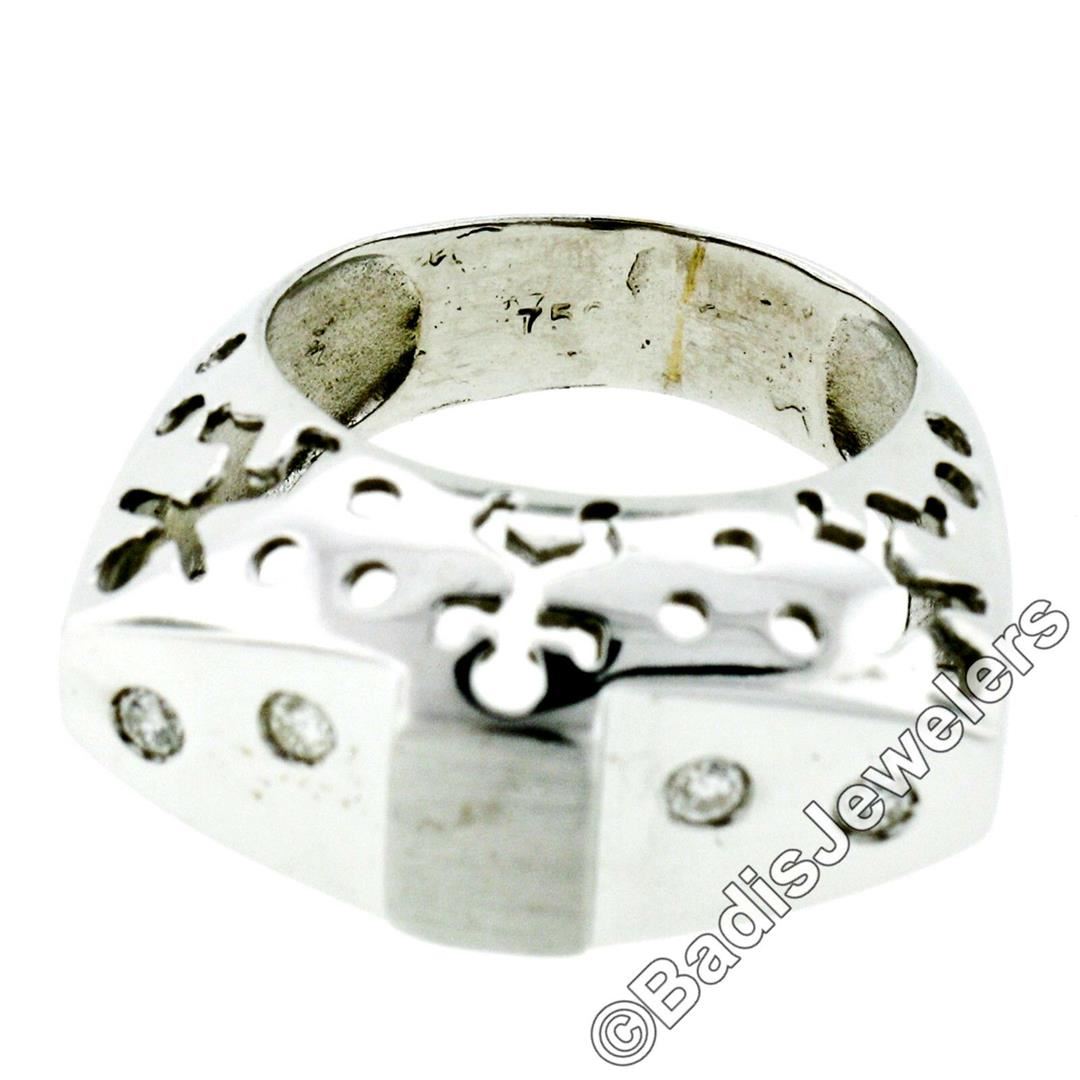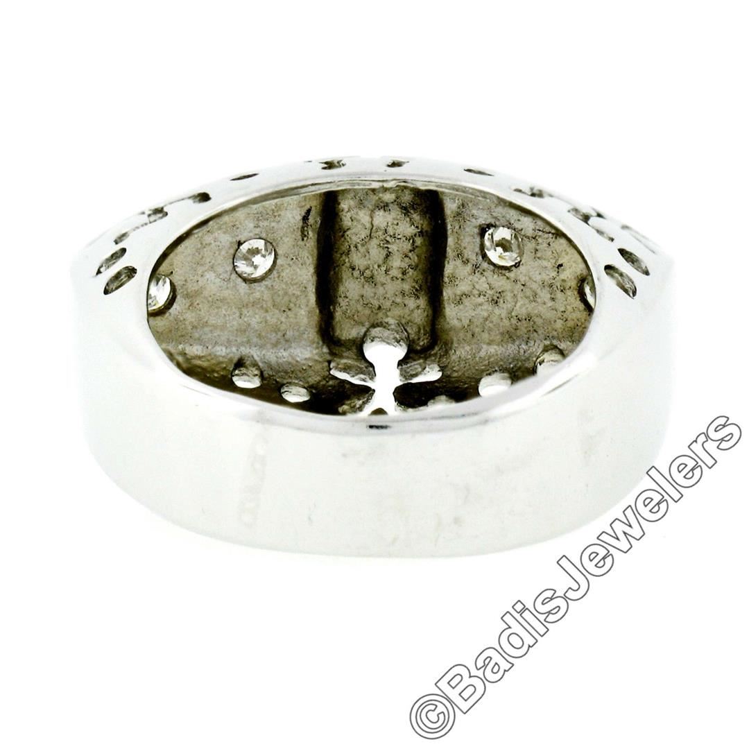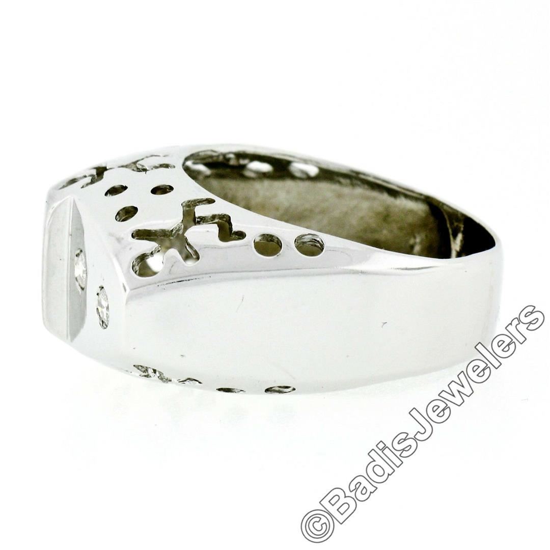 A new 18kt white gold band ring with pierced sides featuring 4 burnish set round brilliant diamonds (I - SI1; 0.16ctw). The ring is size 7.5, weighs a total of 9.30 grams, and measures 11.9mm wide.