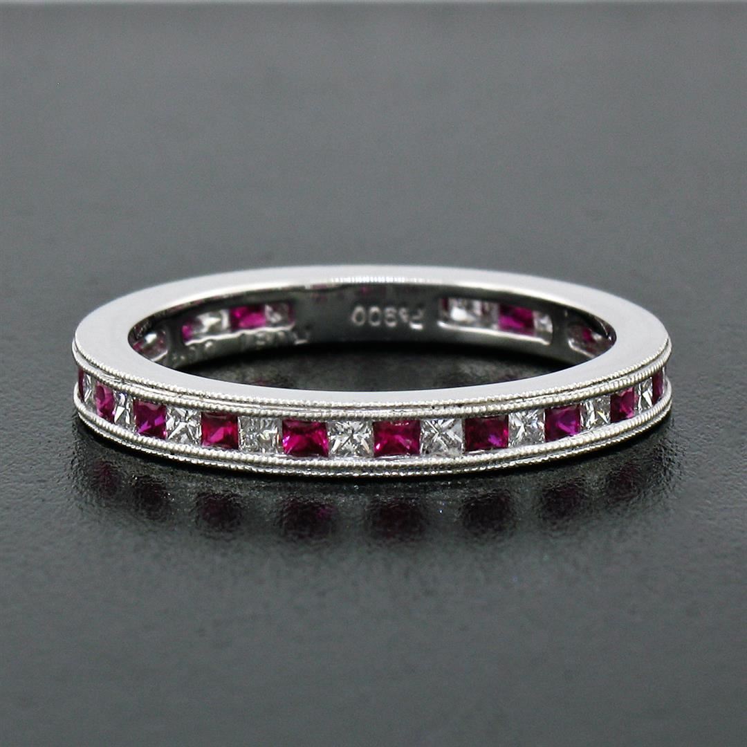 A new solid platinum eternity band ring, with 20 square calibre cut natural rubies (0.51ctw), and 20 square custom cut natural diamonds (G/H- VS1/VS2; 0.41ctw). The ring is size 6.0, weighs a total of 3.43 grams, and measures 2.70mm wide.