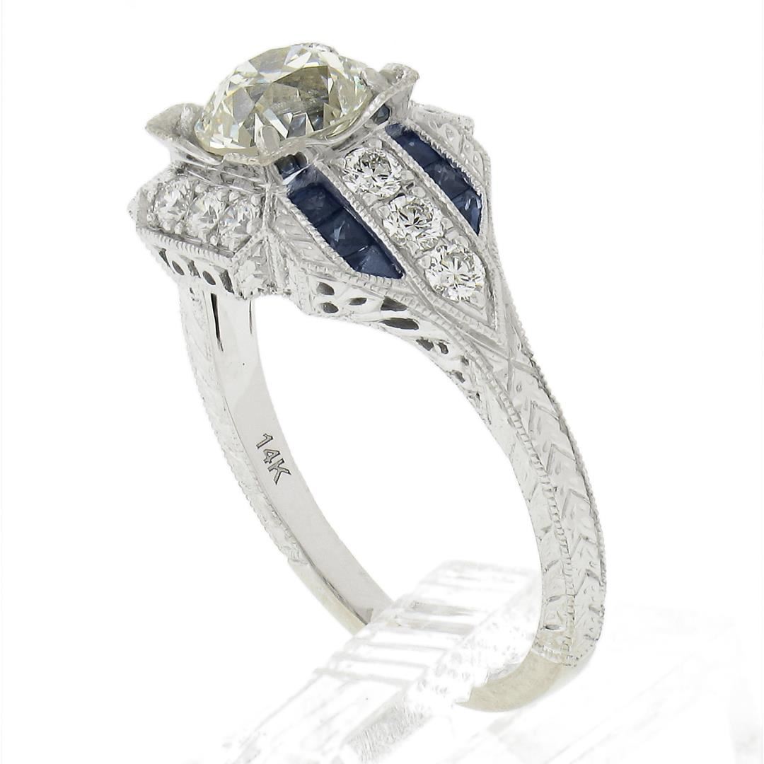 A new 14k white gold ring, with 1 GIA graded old european cut natural diamond (L - VS1 ;1.04ct), and 12 round cut natural diamond (F/G - VS1/VS2 ; 0.35ct ), 12 calibre french cut natural sapphires (0.30ctw). The ring is size 6.5, weighs a total of 4.01 grams, and measures 10.8mm wide. Comes with all original relevant certifications.