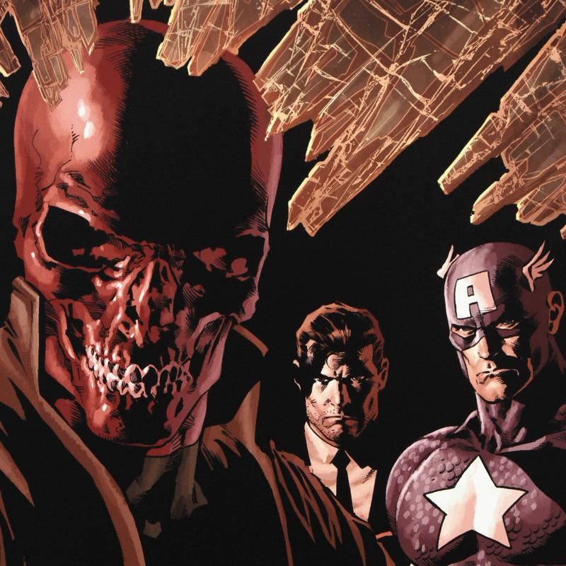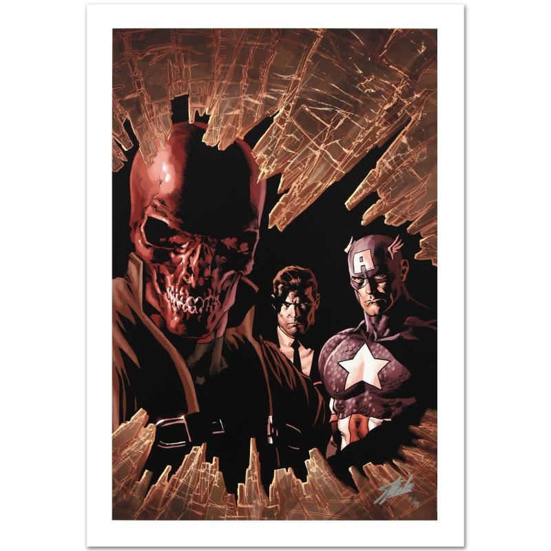 A piece of comic book history, this limited edition, from original art by Mike Deodato Jr., depicts Red Skull, Captain America and Nick Fury. Brazilian artist Mike Deodato Jr. has become an enduring fan favorite, working in styles ranging from wildly energetic cartooning to moody photorealism. Deodato became one of the decade's most prolific and in-demand artists, including Marvel credits such as Avengers, Elektra, Incredible Hulk, Spider-Man and Thor. "New Avengers #12" is a limited edition giclee on canvas by Mike Deodato Jr. presented by Marvel Comics, numbered and hand signed by the great Stan Lee! Includes Certificate of Authenticity! Measures approx. 18" x 27" (image).