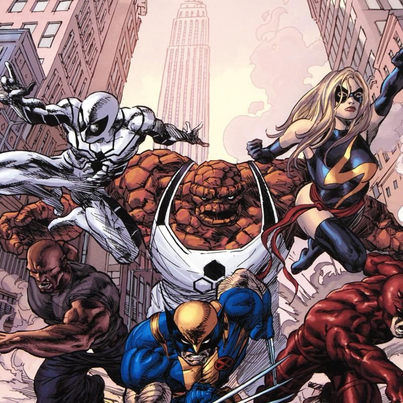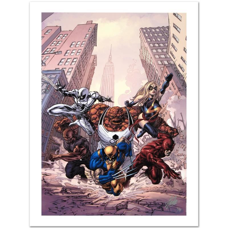 A piece of comic book history, this limited edition, from original art by Mike Deodato Jr., depicts Wolverine, Daredevil, Thing, Luke Cage, Ms. Marvel, and Spider Man. Brazilian artist Mike Deodato Jr. has become an enduring fan favorite, working in styles ranging from wildly energetic cartooning to moody photorealism. Deodato became one of the decade's most prolific and in-demand artists, including Marvel credits such as Avengers, Elektra, Incredible Hulk, Spider-Man and Thor. "New Avengers #17" is a limited edition giclee on canvas by Mike Deodato Jr. presented by Marvel Comics, numbered and hand signed by the great Stan Lee! Includes Certificate of Authenticity! Measures approx. 18" x 27" (image).