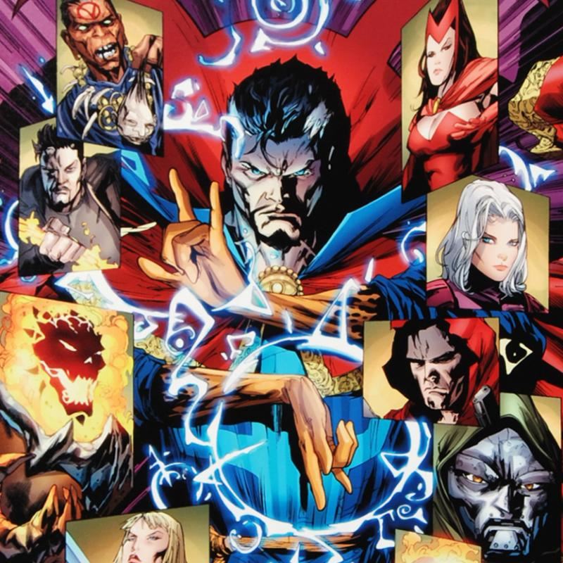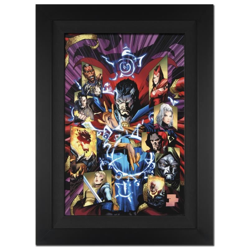 A piece of comic book history, this limited edition piece from art originally drawn by Billy Tan, depicts Dr. Strange. Billy Tan grew up in Malaysia and moved to the United States in 1989 to study business at the University of Kentucky. He began working as a penciler for Image Comics in the 1990s. Tan became the regular artist of the Marvel Comics series Uncanny X-Men in 2006. In 2008, he was invited to draw New Avengers Secret Invasion tie-in issues #41 and 43-44. "New Avengers #51" is an extremely limited edition giclee on canvas by Billy Tan presented by Marvel Comics, hand signed by the great Stan Lee and numbered out of only 10! This piece comes custom framed and ready to hang. Includes Certificate of Authenticity! Measures approx. 25" x 34" (with frame), 18" x 27" (image).