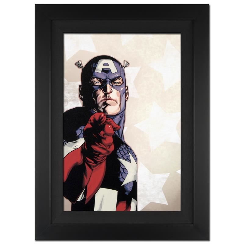 A piece of comic book history, this limited edition, from original art by Stuart Immonen, depicts the classic character Captain America. Stuart Immonen is a Canadian comic book artist. He is best known for his work on Nextwave, Ultimate X-Men, The New Avengers and Ultimate Spider-Man. Immonen studied at Toronto's York University, pursuing a career in art. In 1988, he self-published a series called Playground; it was his first published work. He worked at several smaller comic book companies before being hired by DC Comics and Marvel Comics in 1993. "New Avengers #61" is an extremely limited edition numbered giclee on canvas by Stuart Immonen presented by Marvel Comics, hand signed by the great Stan Lee and numbered out of only 10! This piece was custom framed and ready to hang. Includes Certificate of Authenticity! Measure approx. 25" x 34" (with frame), 18" x 27" (image).
