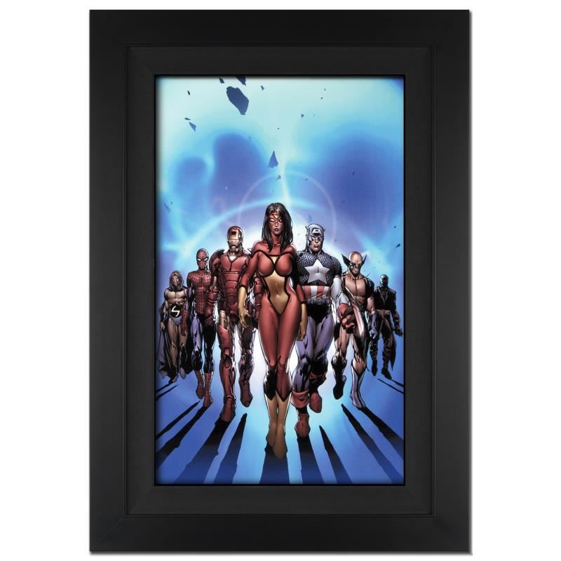 A piece of comic book history, this limited edition, from original art by David Finch, depicts Captain America, spider Woman, Iron Man, Wolverine, Spider Man, Sentry, and Ronin. In 2003, Finch came to Marvel Comics for a year-long arc on Ultimate X-Men, after which he began work on The Avengers and thereafter The New Avengers. He has also worked on such titles as Captain America, Spider-Man and the Hulk. "New Avengers #7" is an extremely limited edition giclee on canvas by David Finch presented by Marvel Comics, hand signed by the great Stan Lee and numbered out of only 10! This piece comes custom framed and ready to hang. Includes Certificate of Authenticity! Measures approx. 25" x 34" (with frame); 18" x 27" (image).