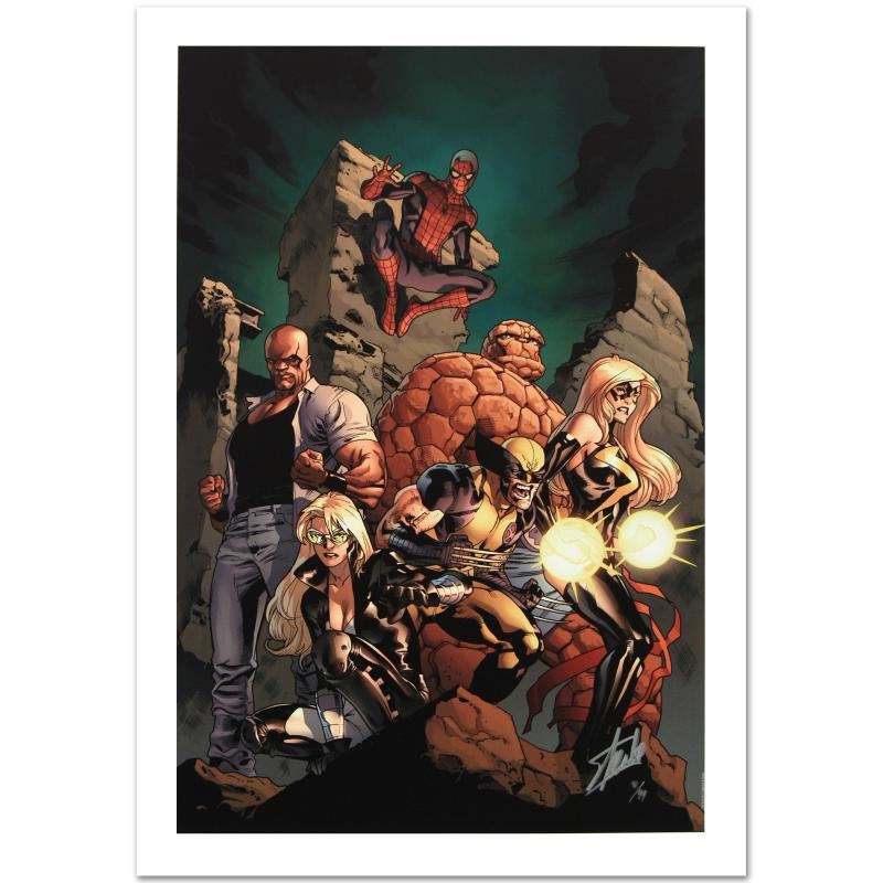 A piece of comic book history, this limited edition, from original art by Tim Bradstreet, depicts Mockingbird, Ms. Marvel, Wolverine, Thing, Luke Cage, and Spider-Man. Tim Bradstreet entered the comic book industry in 1990. Bradstreet was the regular cover artist for Marvel's Punisher and DC's HellBlazer. Bradstreet was awarded the 1996 Best Artist award by the International Horror Guild. In 2005 He was nominated again for his work on Hellblazer. In 2002 he was nominated for the Best Cover Artist Eisner Award for his Hellblazer covers. Bradstreet's work has extended into the video game industry as well as the film industry. "New Avengers #7" is a limited edition giclee on canvas by Tim Bradstreet presented by Marvel Comics, numbered and hand signed by the great Stan Lee! Includes Certificate of Authenticity! Measures approx. 18" x 27" (image).