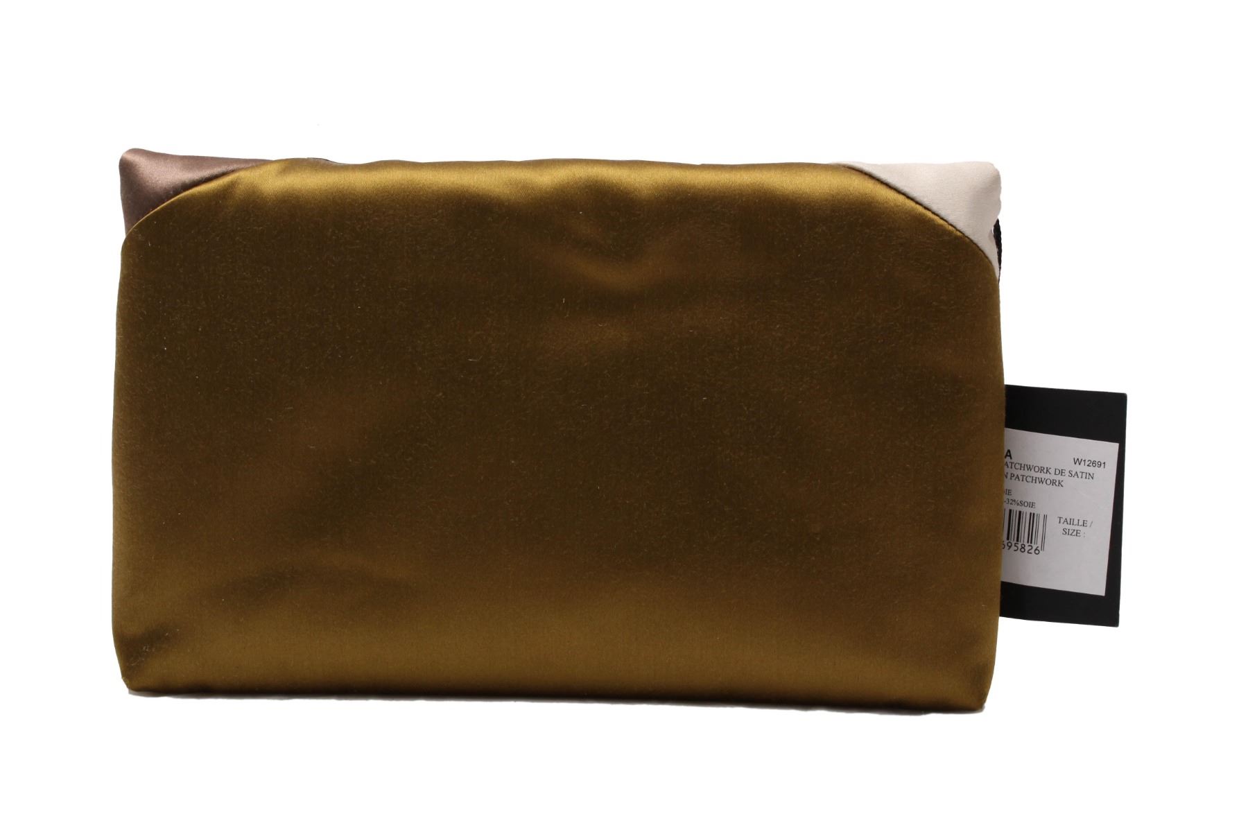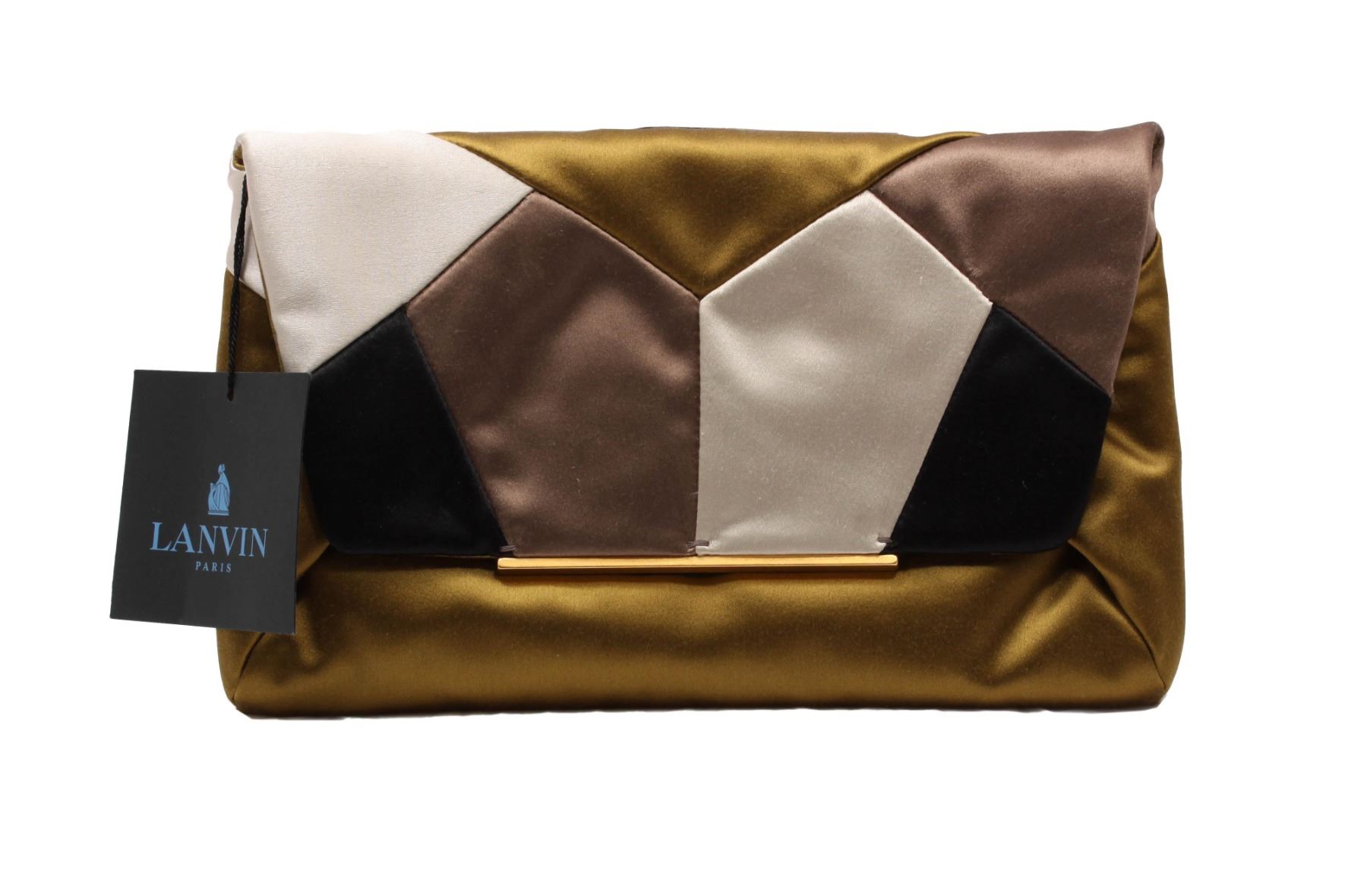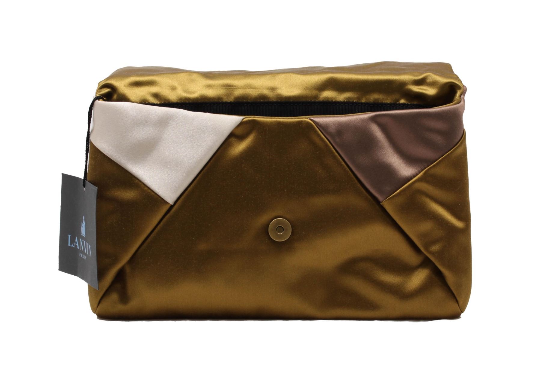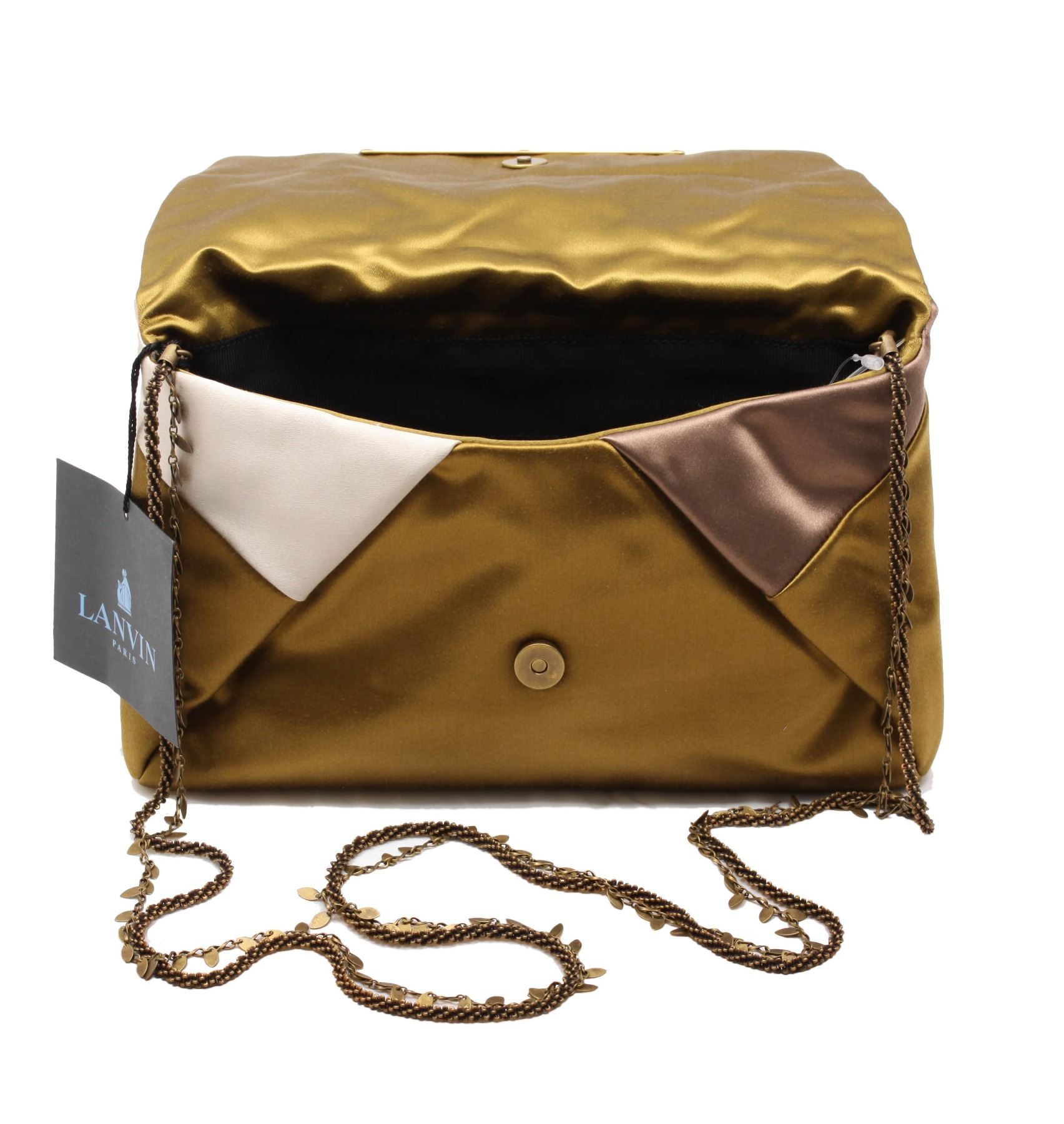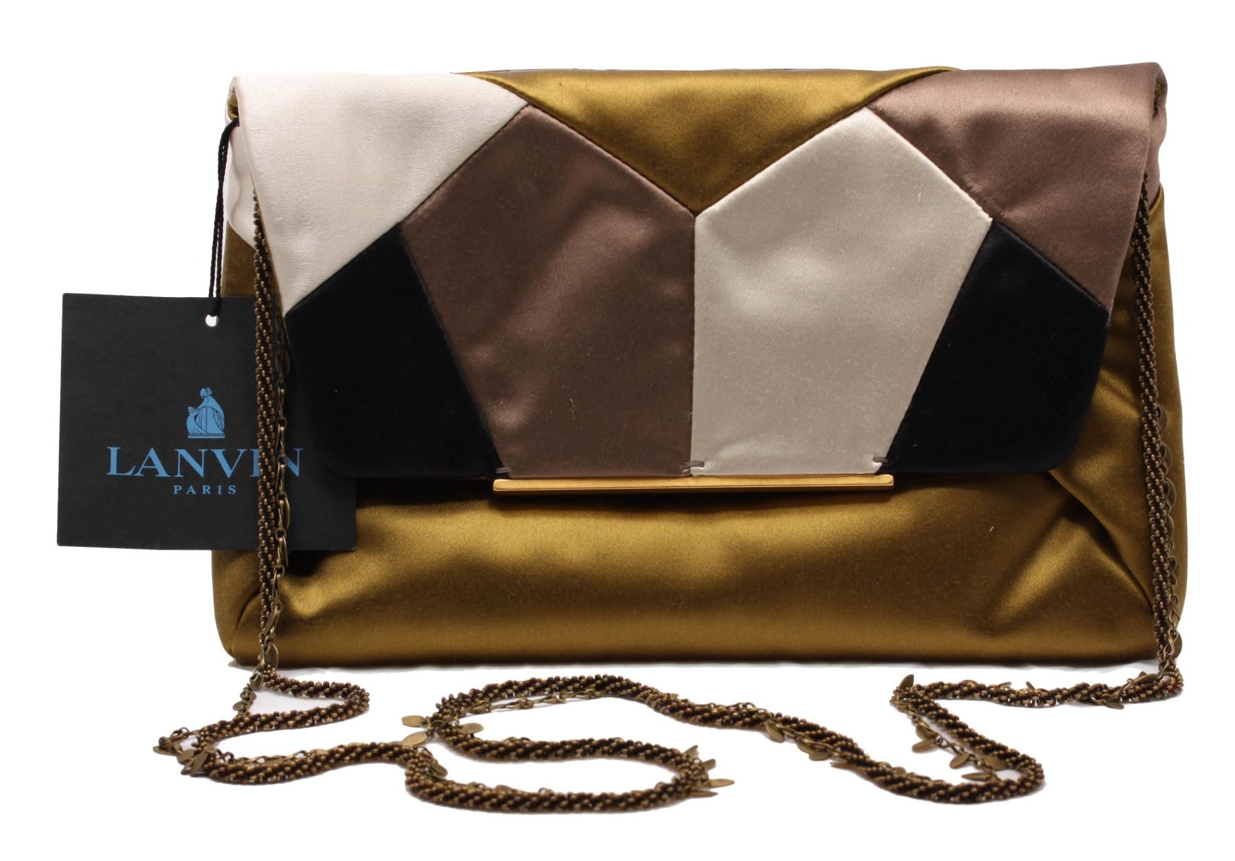 One Gorgeous cream, taupe, black and olive green patchwork satin clutch with hidden chain strap by Lanvin. Retails for $985, sold out. Comes with original dust bag. Measures 9.5 inches by 6 inches.