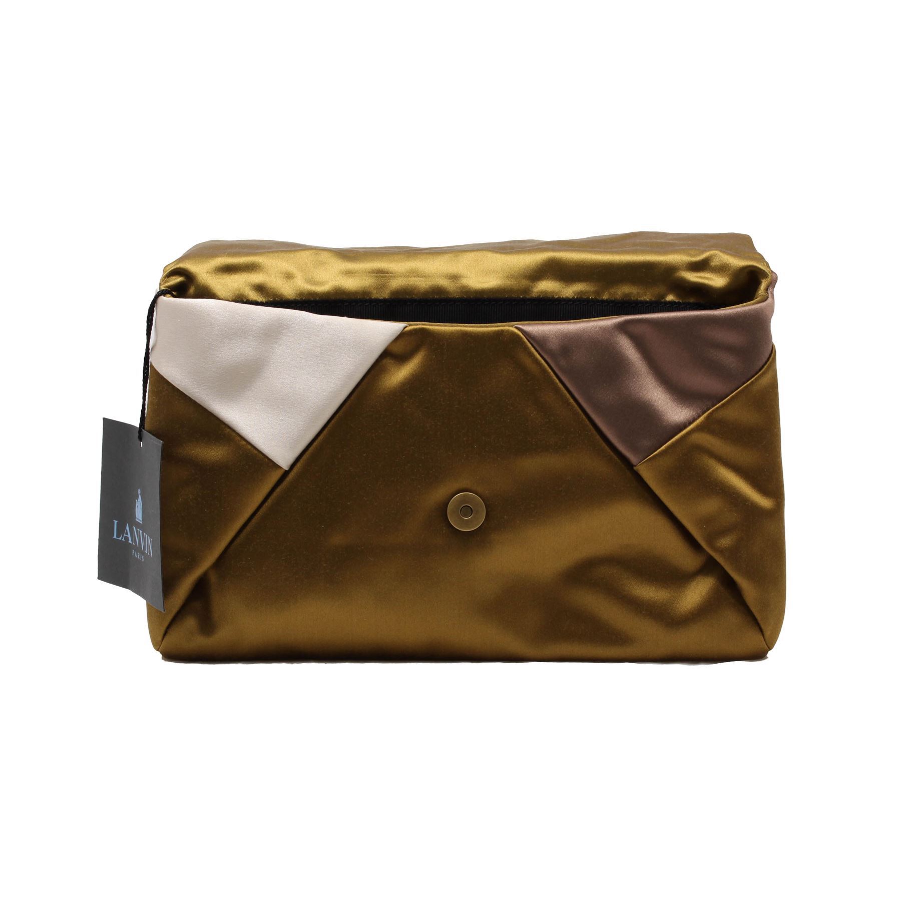 One Gorgeous cream, taupe, black and olive green patchwork satin clutch with hidden chain strap by Lanvin. Retails for $985, sold out. Comes with original dust bag. Measures 9.5 inches by 6 inches.