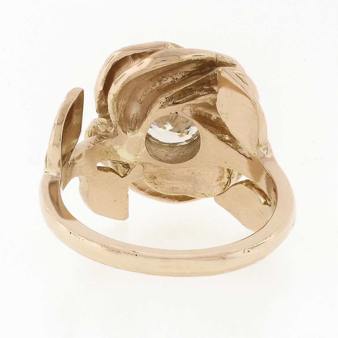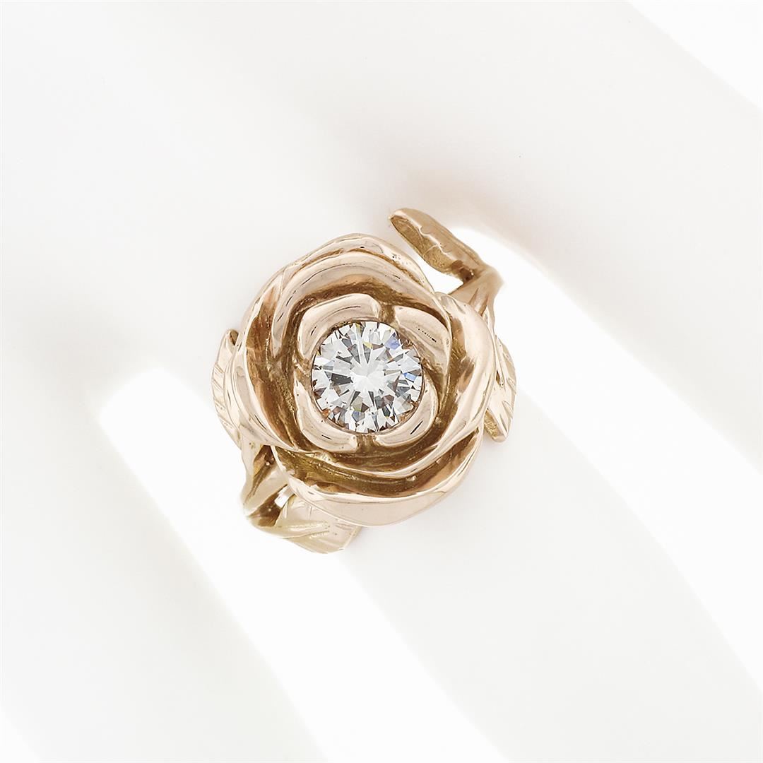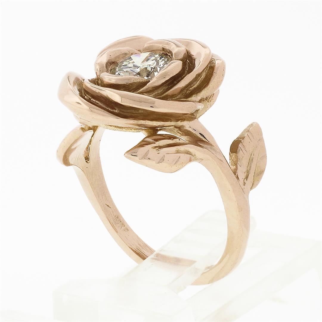 A new solid 18k rose gold rose flower ring, with 1 round brilliant cut natural diamond (H- VS2; 0.72ct). The ring is size 5.5, weighs a total of 8.9 grams, and measures 15.1mm wide.
