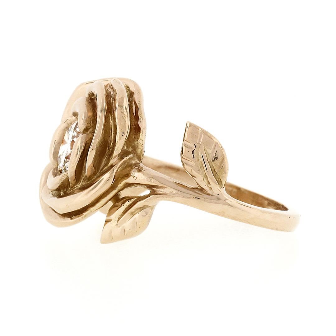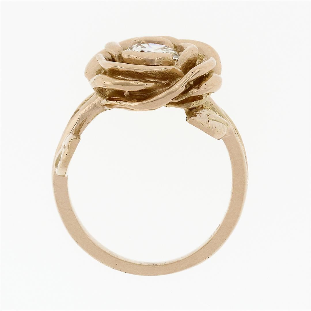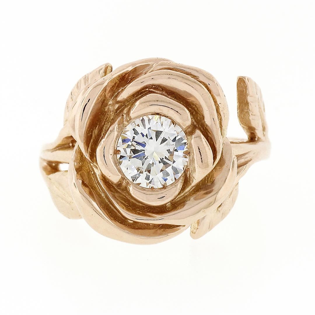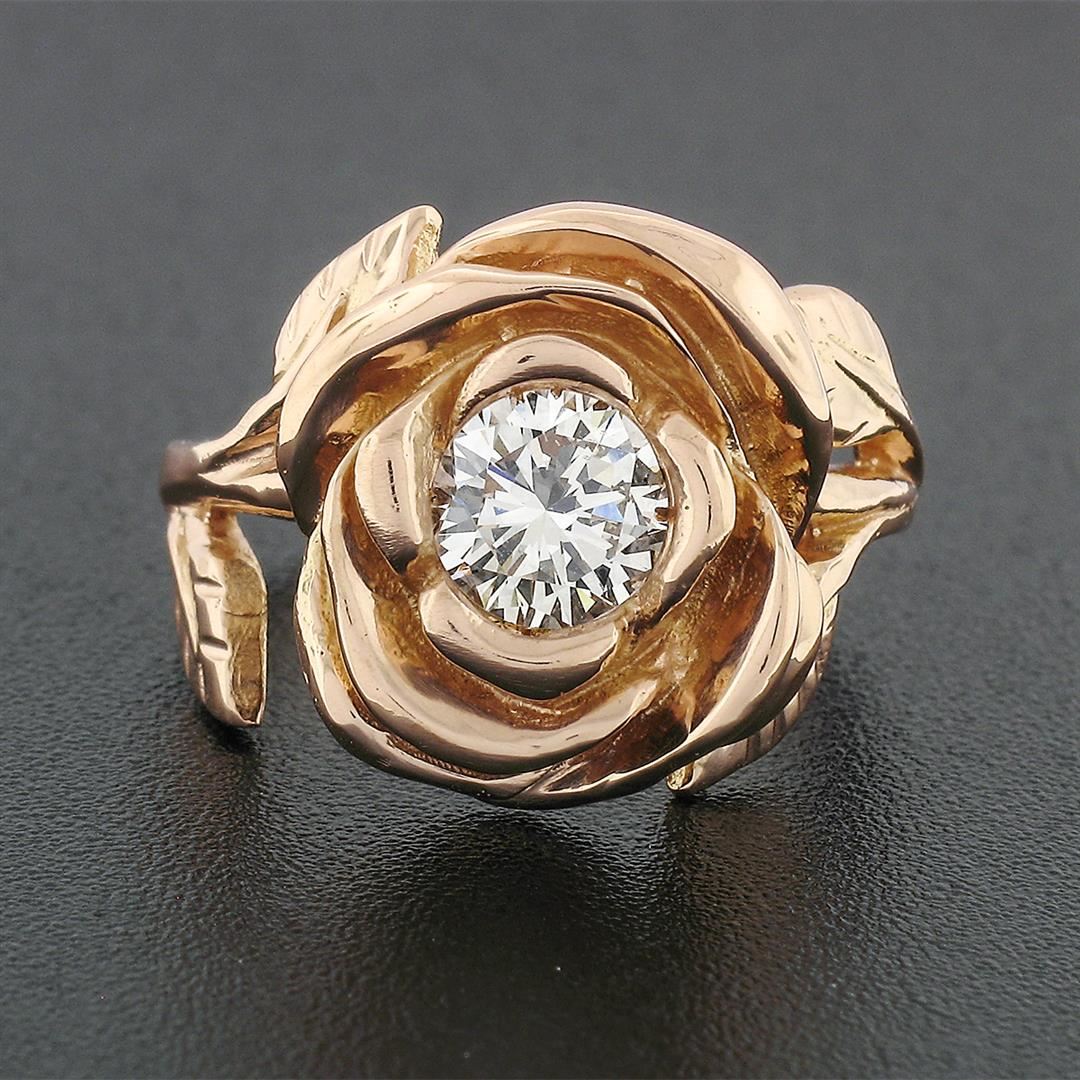 A new solid 18k rose gold rose flower ring, with 1 round brilliant cut natural diamond (H- VS2; 0.72ct). The ring is size 5.5, weighs a total of 8.9 grams, and measures 15.1mm wide.