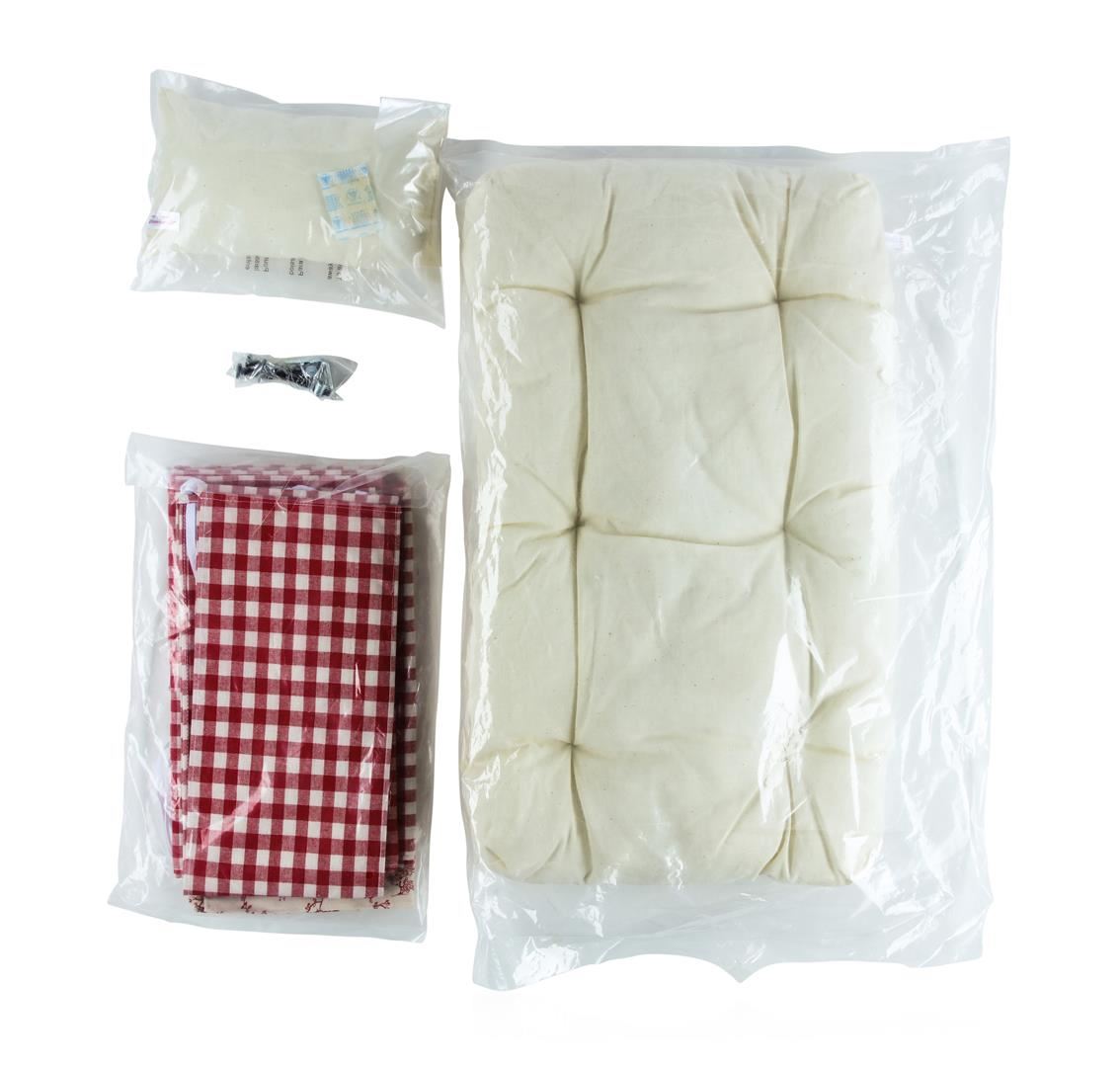 New In Box American Girl "Felicity's Bed" With Bedding and Drapes. Featuring a hardwood bed. A soft mattress and pillow covered with a red toile counter panel. Traditional checked bed hangings to keep out the drafty night air. A matching tester, or canopy, for an elegant look - it also fits Elizabeth's bed.
