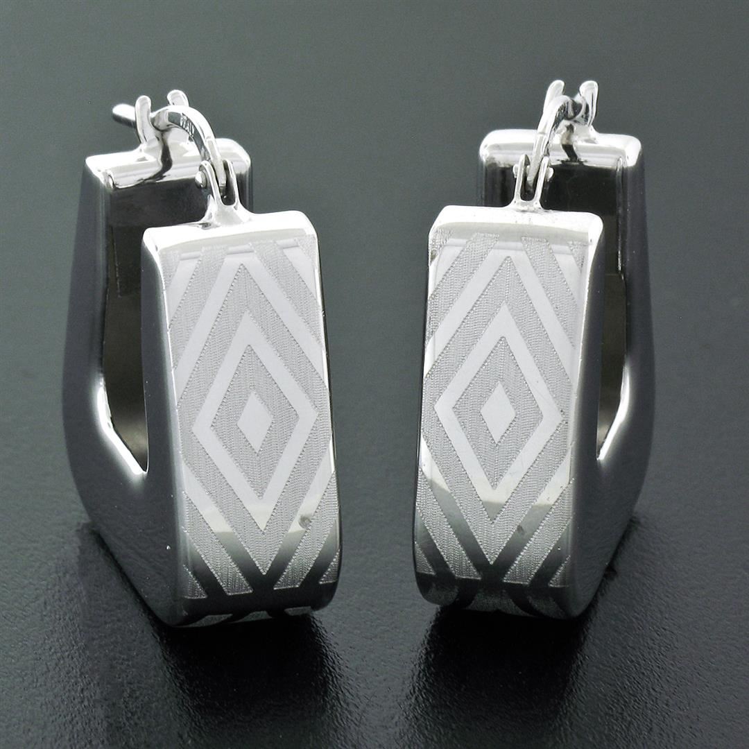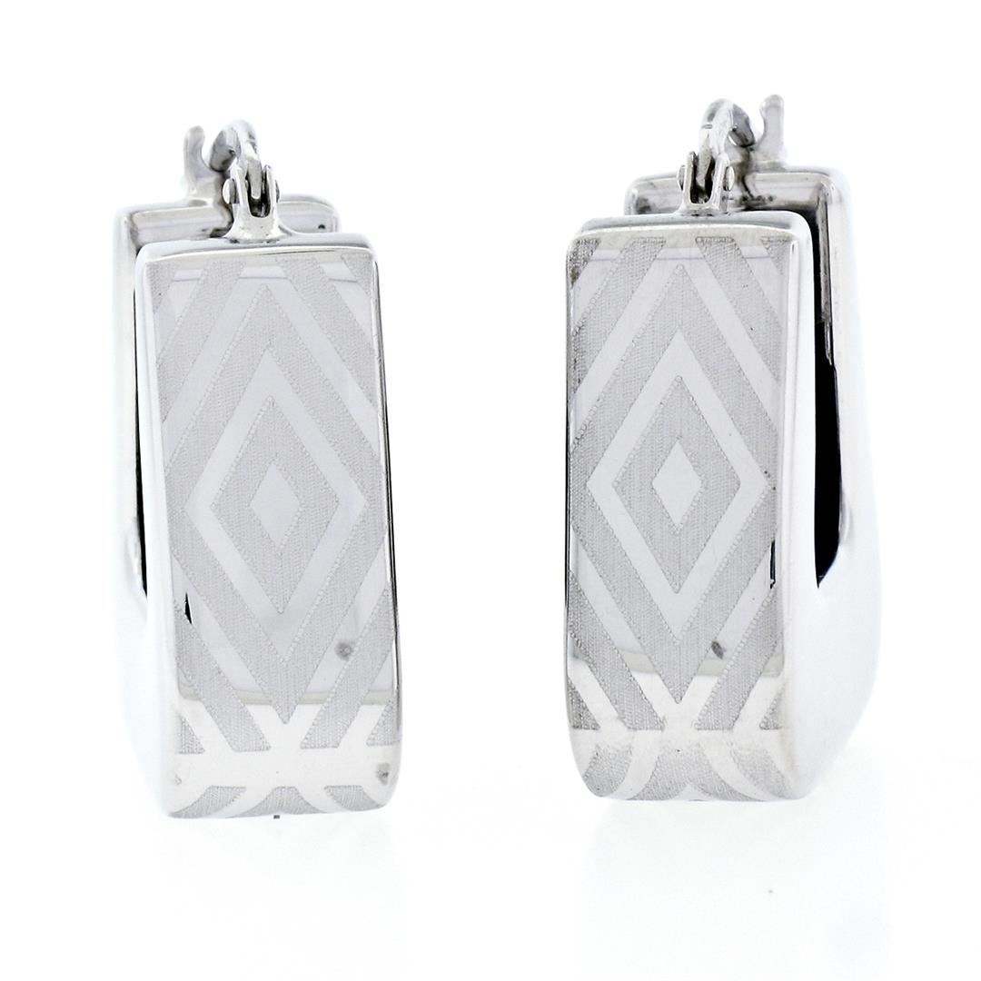 New Italian 14K White Gold Dual Finished Marquise Pattern Huggie Snap Earrings. Please see photos and description for all available information. A new solid 14k white gold italian huggie snap earrings. The earrings measure approximately 17.90x7.25mm and weigh a total of 5.22 grams.