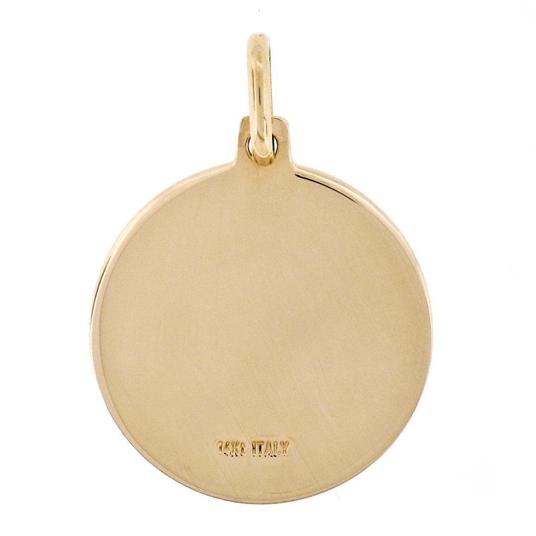 A new solid 14k yellow gold italian confirmation medallion charm pendant. The pendant weighs a total of 2.8 grams, measures 26.30x18.50mm including the bail, and the inside of the bail measures 5.85x3.40mm.