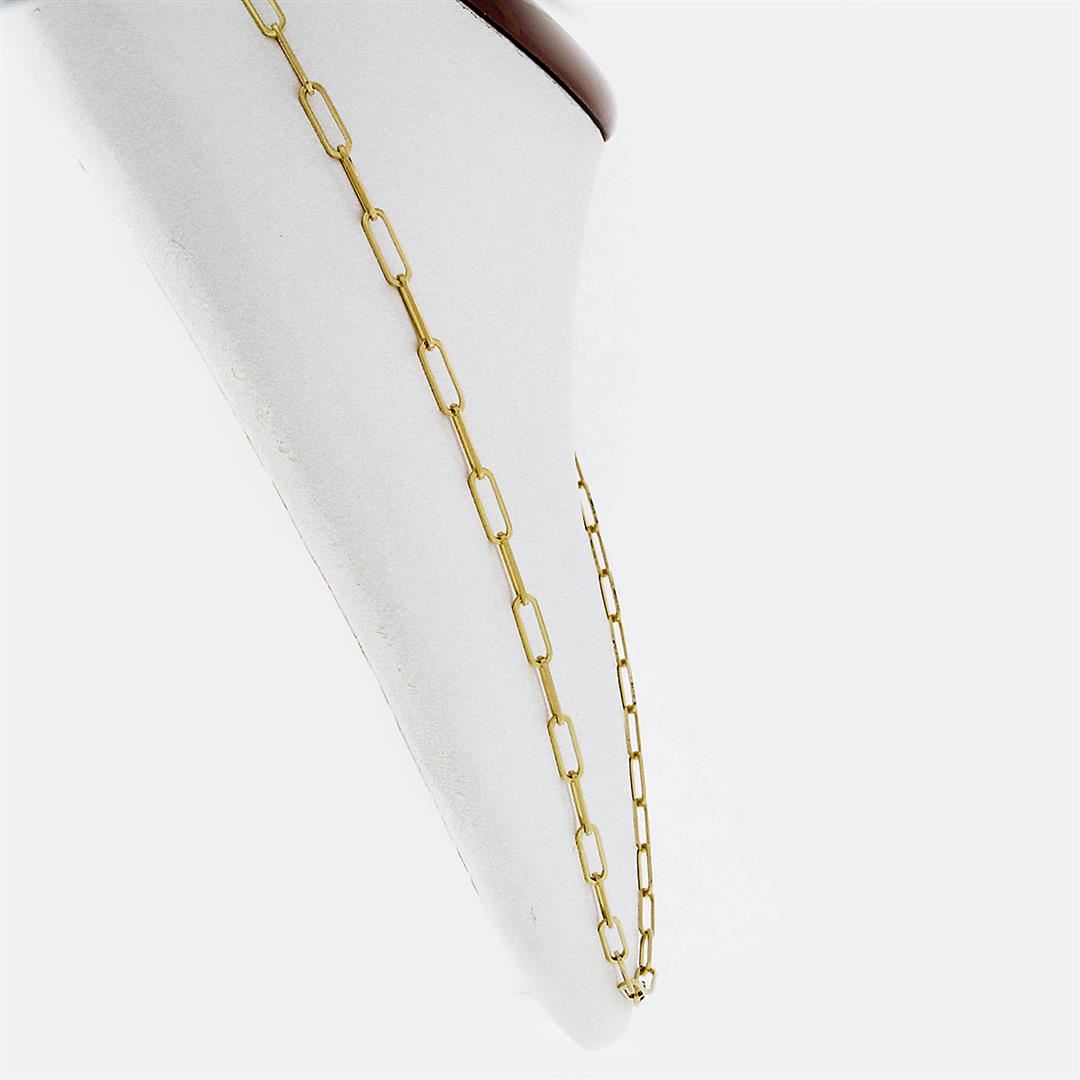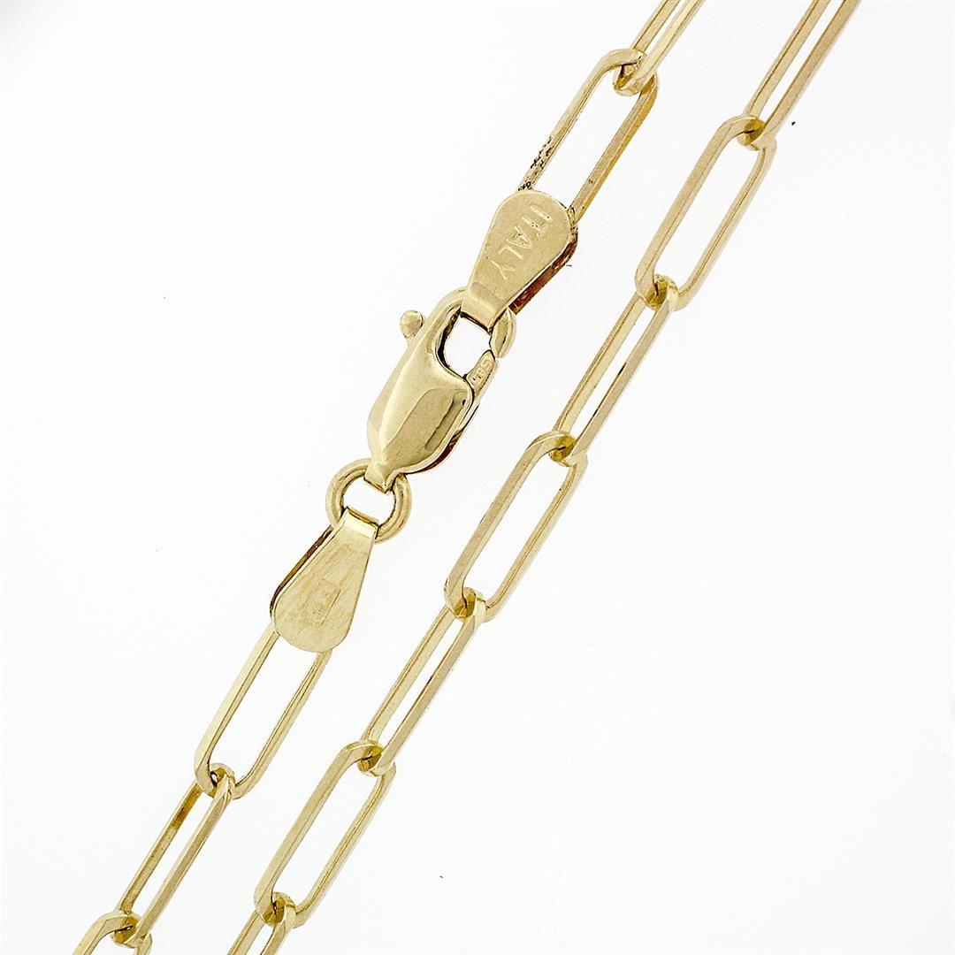 A new italian solid 14k yellow gold chain necklace. 22 inch open oval paperclip link chain, 7.48 grams total weight, pendant measures 3.5x2.3mm.