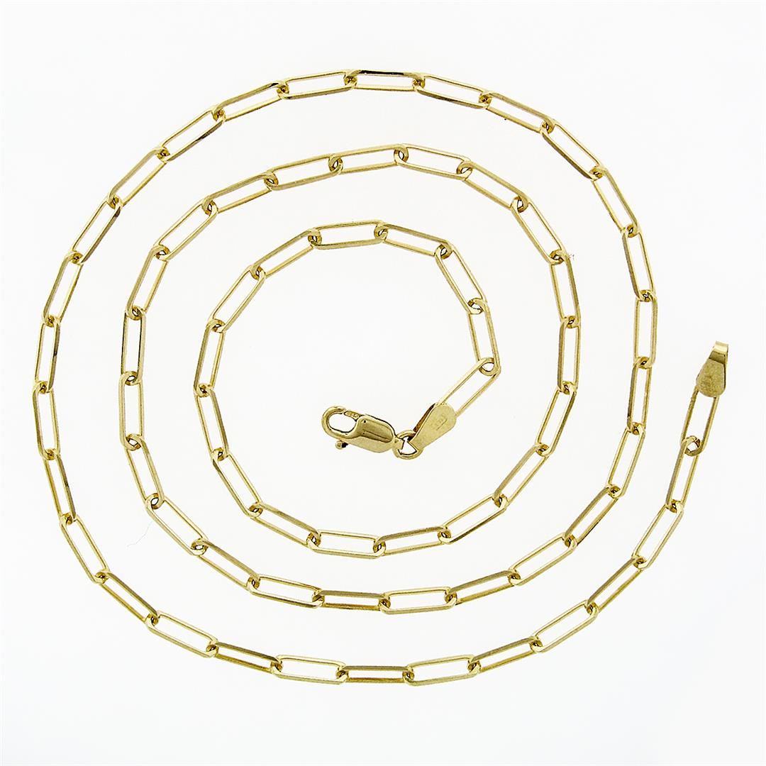 A new italian solid 14k yellow gold chain necklace. 22 inch open oval paperclip link chain, 7.48 grams total weight, pendant measures 3.5x2.3mm.