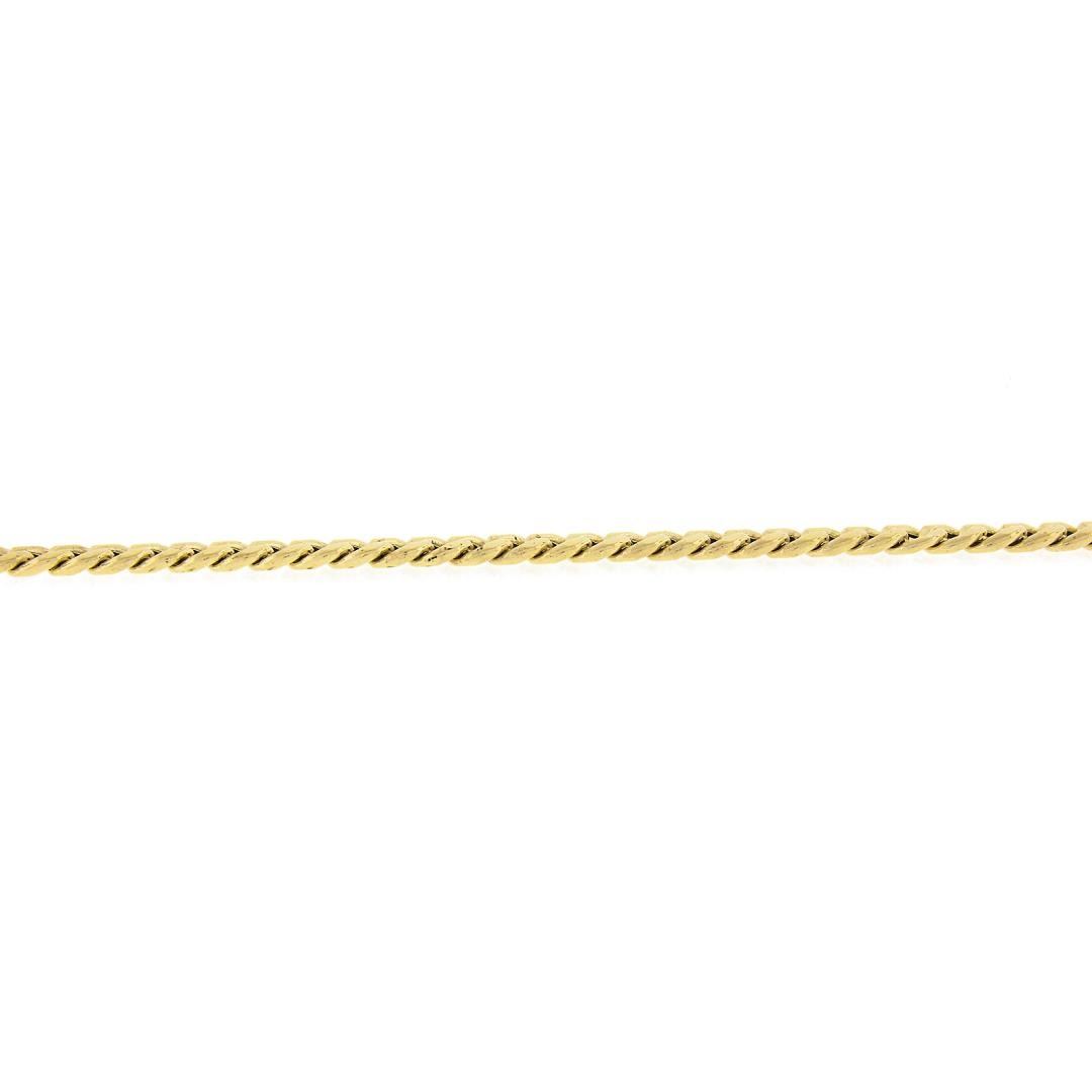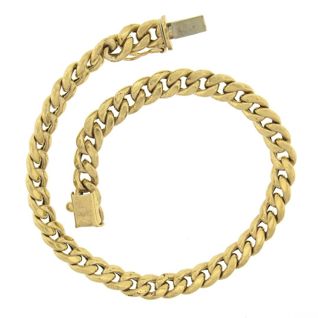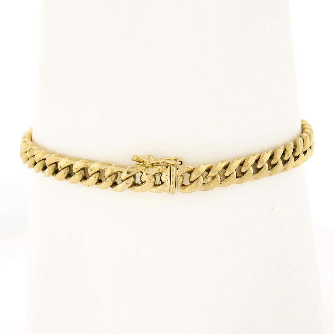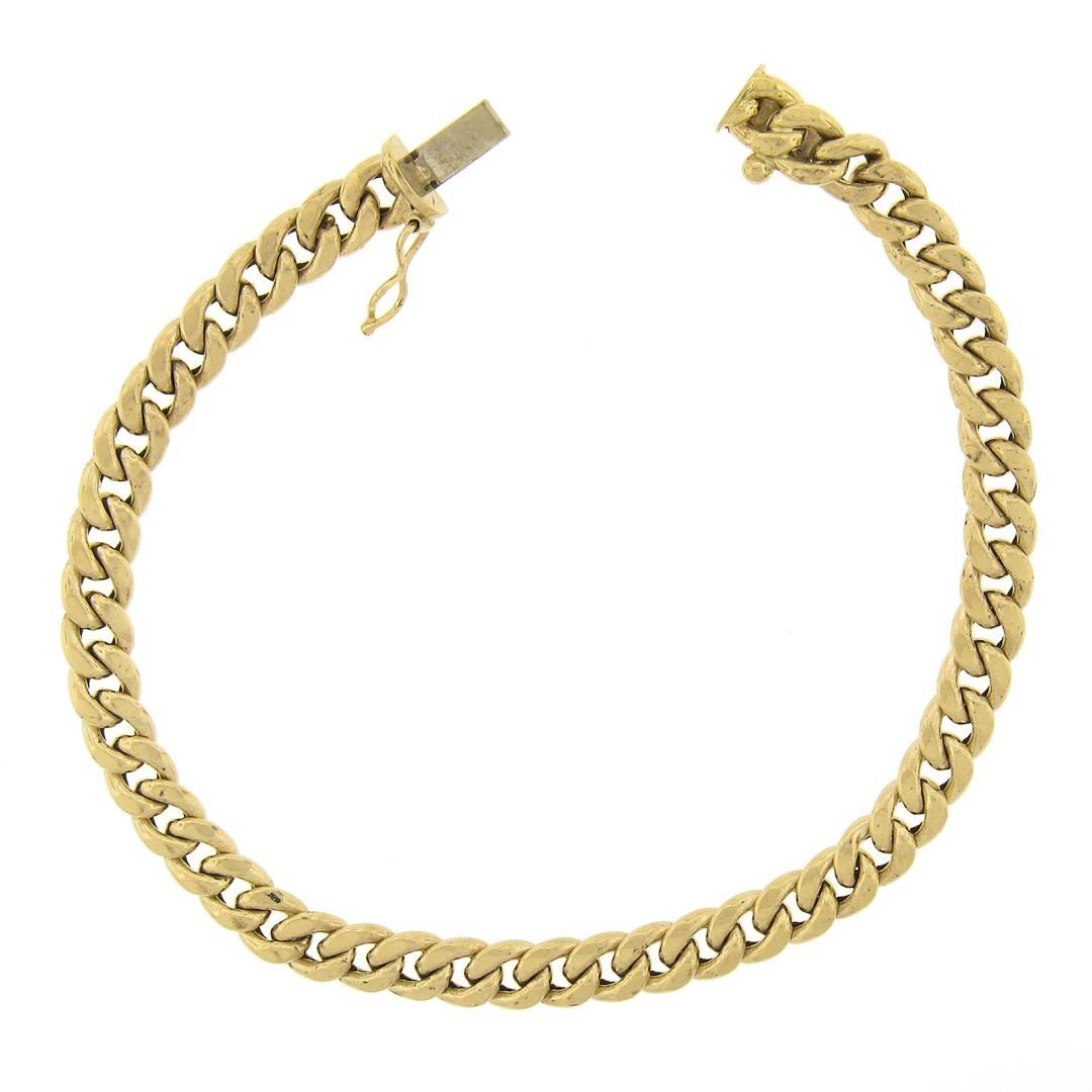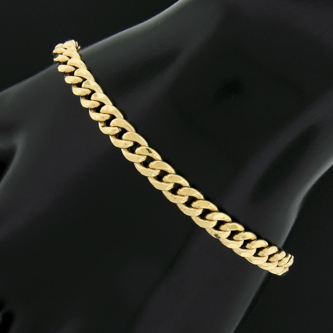A new solid 14k yellow gold Cuban curb link bracelet. It weighs a total of 6.90 grams, measures 5.2mm wide, and measures 6.75 inches in length.