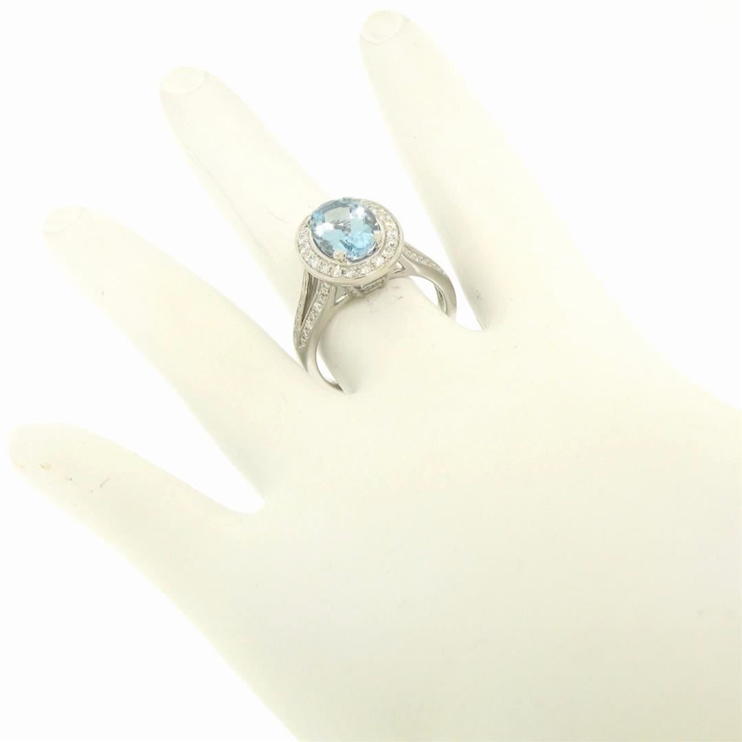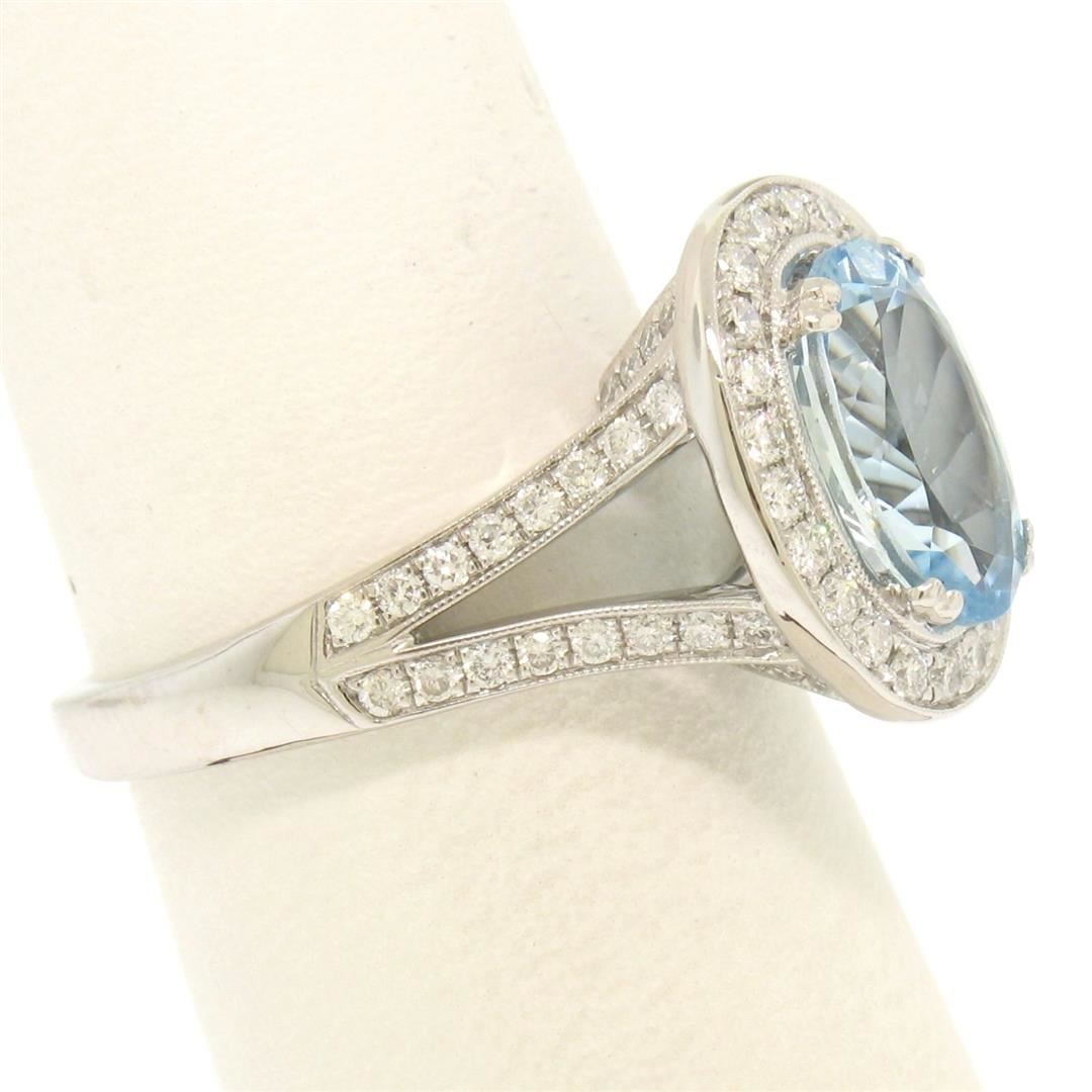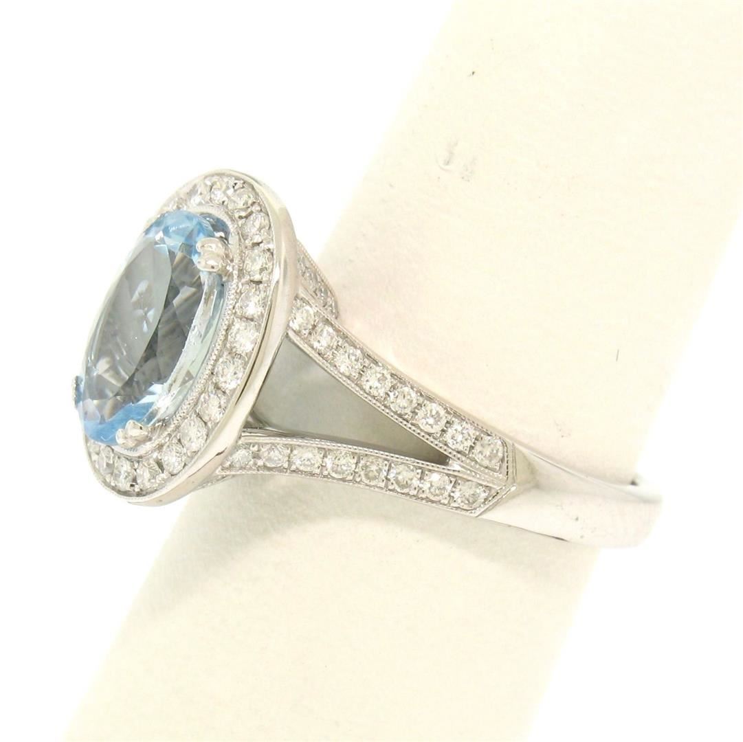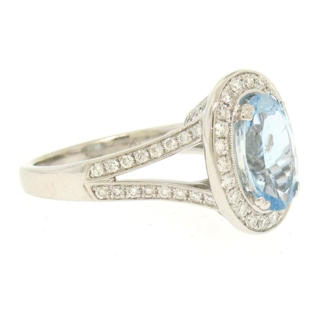 A new solid 18k white gold solitaire ring, with 1 oval cut natural aquamarine (2.07ct ), surrounded with a halo of 74 round brilliant cut natural diamonds ( F/G- VS1; 1.00ctw). The ring is size 6.0, weighs a total of 6.1 grams, and measures 14.62mm wide.