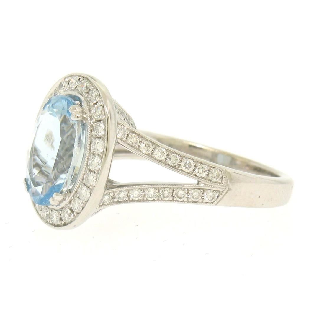 A new solid 18k white gold solitaire ring, with 1 oval cut natural aquamarine (2.07ct ), surrounded with a halo of 74 round brilliant cut natural diamonds ( F/G- VS1; 1.00ctw). The ring is size 6.0, weighs a total of 6.1 grams, and measures 14.62mm wide.