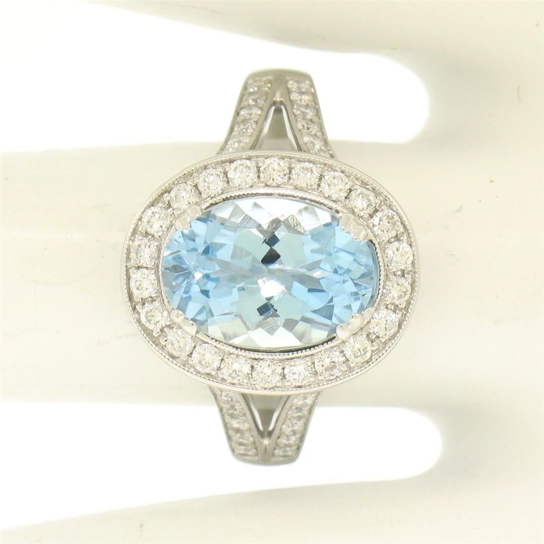 A new solid 18k white gold solitaire ring, with 1 oval cut natural aquamarine (2.07ct ), surrounded with a halo of 74 round brilliant cut natural diamonds ( F/G- VS1; 1.00ctw). The ring is size 6.0, weighs a total of 6.1 grams, and measures 14.62mm wide.