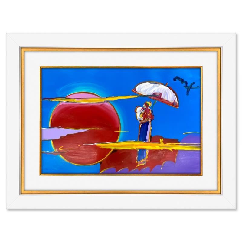 "New Moon 2" is a one-of-a-kind mixed media on paper, hand signed by Peter Max. The piece comes custom framed with a backside cutout to display Peter Max Studio registration number 274657 certifying authenticity. Measures approximately 36" x 48" (frame), 24" x 36" (image). This item requires special handling and may have a longer than usual turnaround.