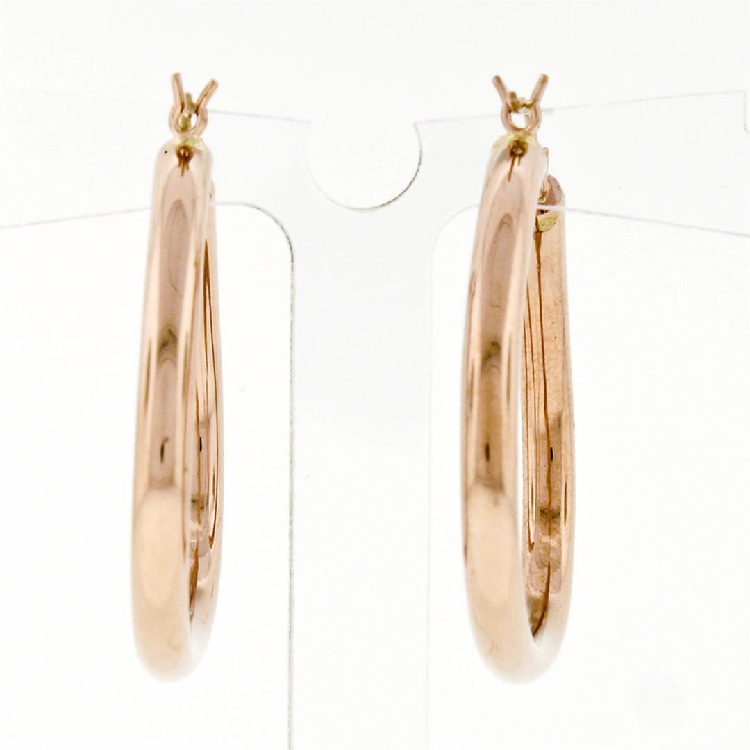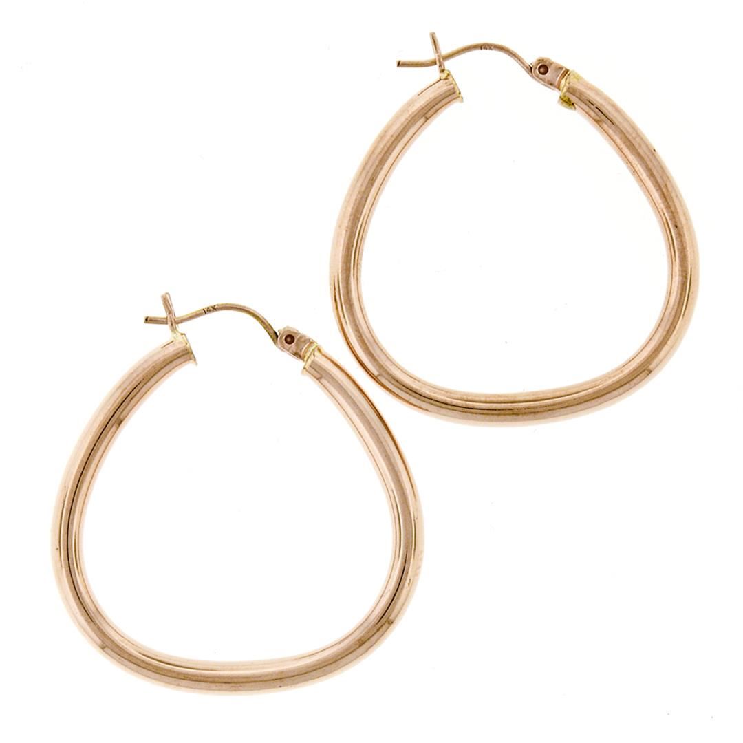 A new solid 14k rose gold plain triangle snap hoop earrings. The earrings measure approximately 32.80x30.55mm and weigh a total of 3.2 grams.