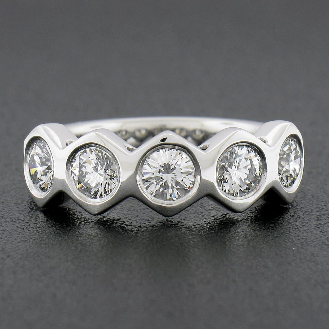 A new platinum band ring, with 5 round cut natural diamonds (F/G - VS1-SI1 ; 1.32ctw). The ring is size 6.0, weighs a total of 9.36 grams, and measures 6.6mm wide.