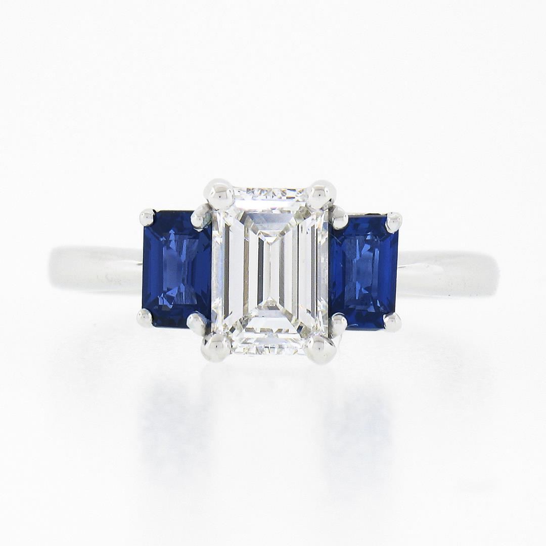 A new platinum 3 stones engagement ring, featuring 1 GIA graded emerald cut natural diamond (G - VS1 ; 0.91ct), and 2 emerald cut natural sapphires (0.80ctw). The ring is size 6.5, weighs a total of 5.13 grams, and measures 7.90mm wide. Comes with all original relevant certifications.
