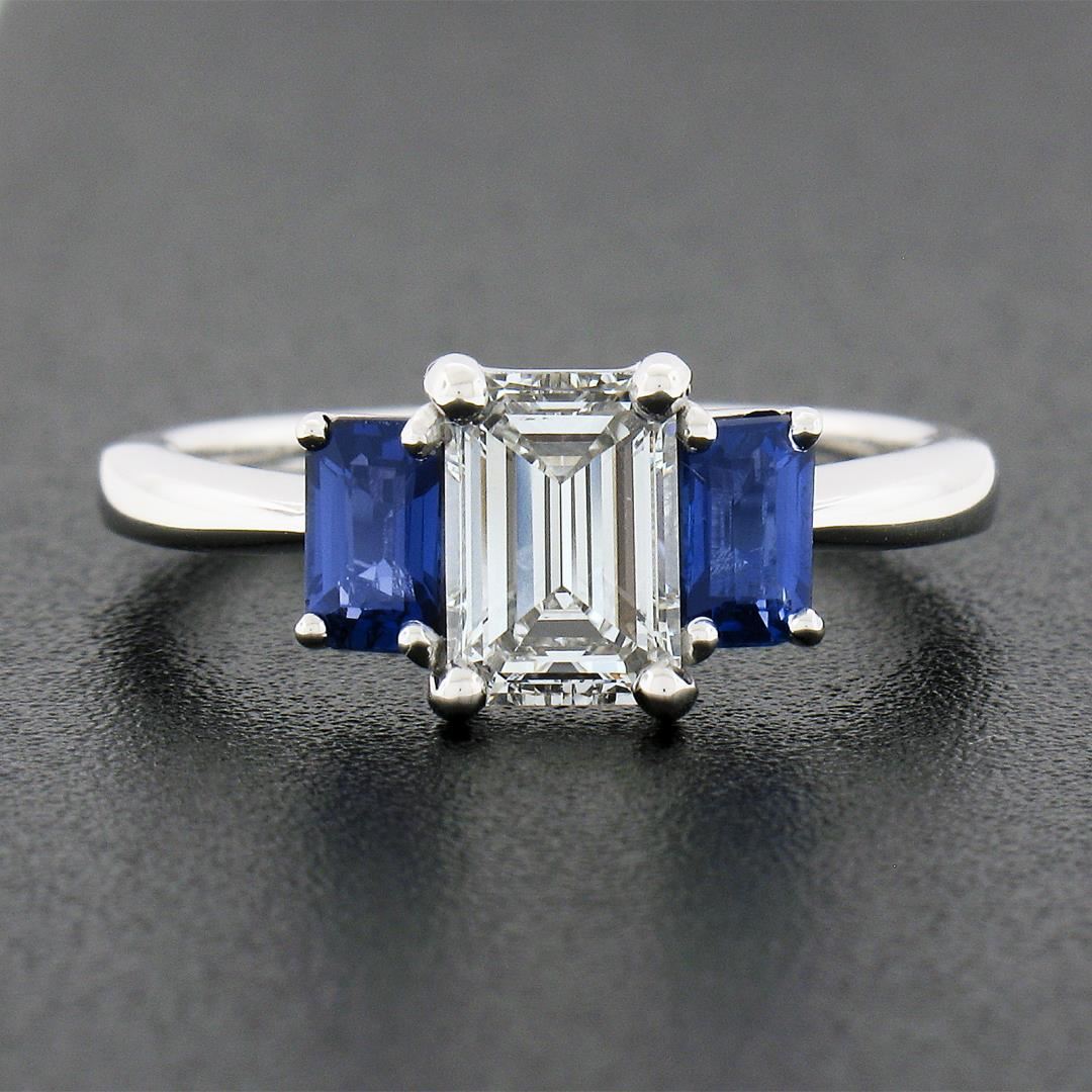 A new platinum 3 stones engagement ring, featuring 1 GIA graded emerald cut natural diamond (G - VS1 ; 0.91ct), and 2 emerald cut natural sapphires (0.80ctw). The ring is size 6.5, weighs a total of 5.13 grams, and measures 7.90mm wide. Comes with all original relevant certifications.