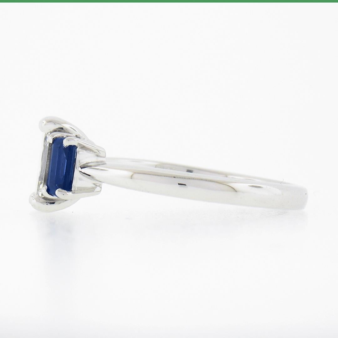 A new platinum 3 stones engagement ring, featuring 1 GIA graded emerald cut natural diamond (G - VS1 ; 0.91ct), and 2 emerald cut natural sapphires (0.80ctw). The ring is size 6.5, weighs a total of 5.13 grams, and measures 7.90mm wide. Comes with all original relevant certifications.