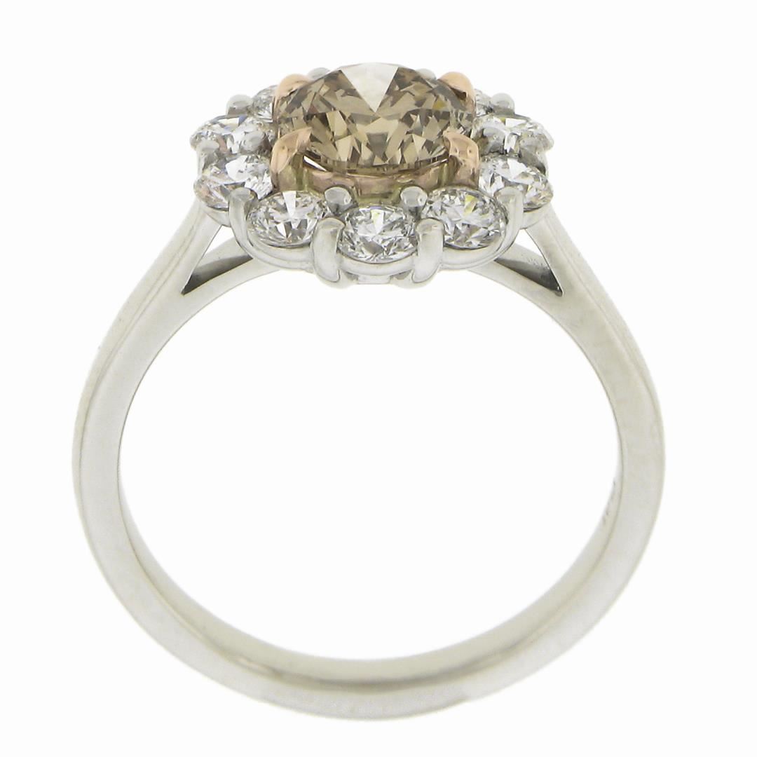 A new solid platinum & 14k rose gold cluster ring, with 1 GIA graded round cut fancy brown natural diamond (SI1 ; 1.15ct), with a halo of 10 round cut natural diamonds (F/G - VS1/VS2 ; 0.97ctw). The ring is size 6.5, weighs a total of 5.98 grams, and measures 12.8mm wide. Comes with all original relevant certifications.