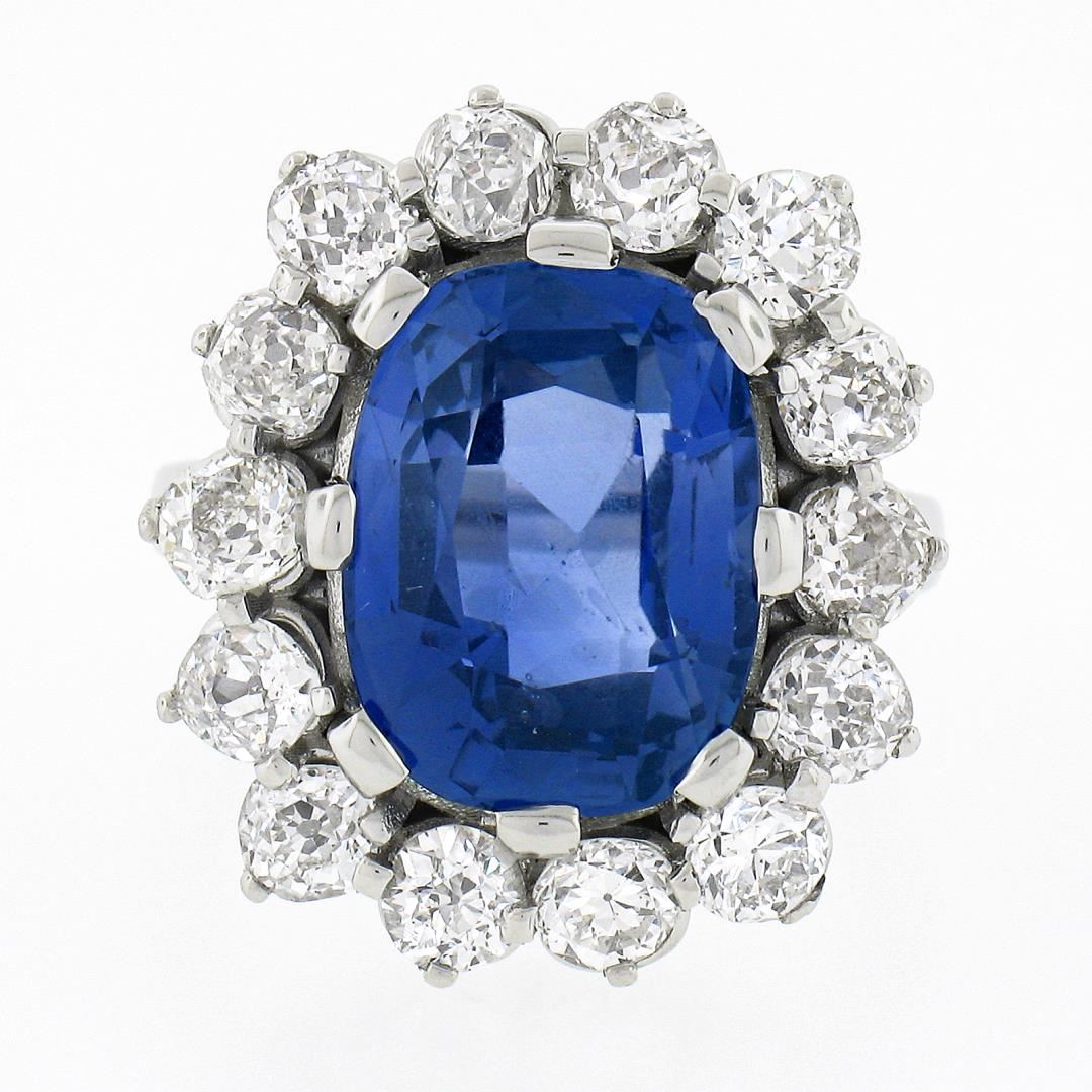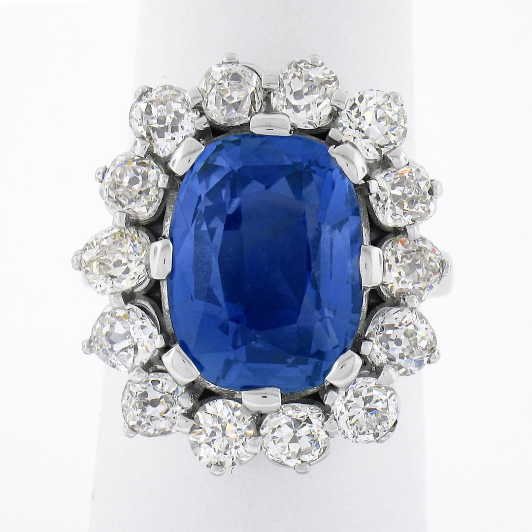 A new platinum large ring, with 1 AGL graded old cut natural sapphire (NO HEAT - 8.40ct), & a halo of 14 old mine 7 old european cut natural diamonds (G/H - VS1/VS2 ; 2.82ctw). The ring is size 6.5, weighs a total of 15.61 grams, and measures 21.90mm wide. Comes with all original relevant certifications.