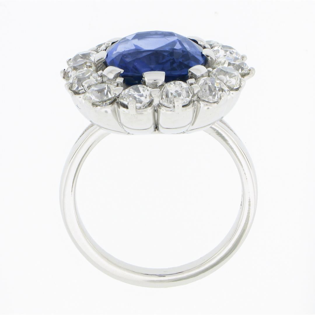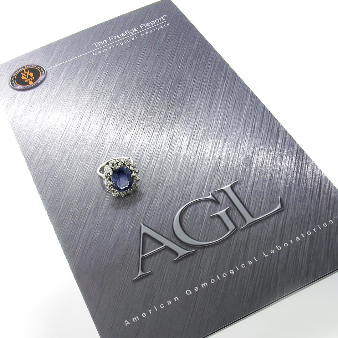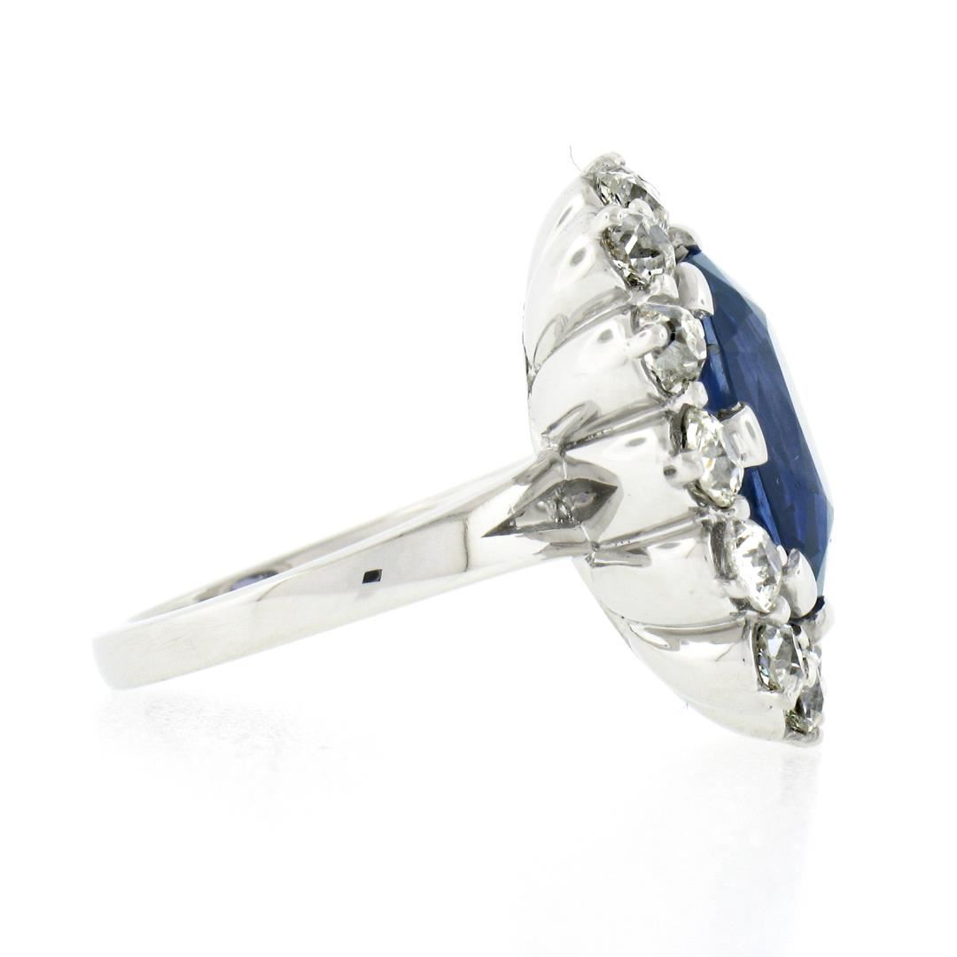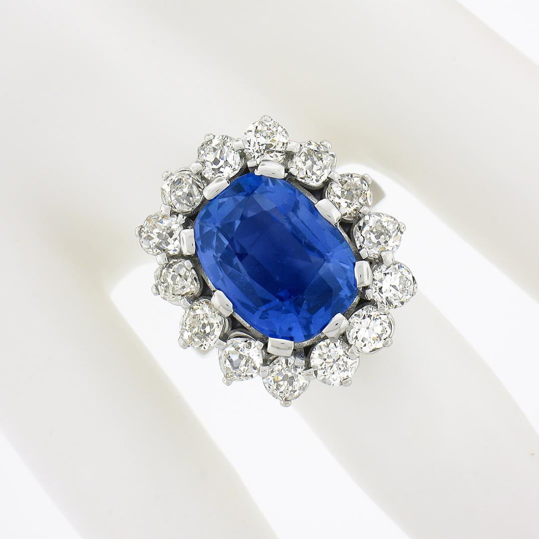 A new platinum large ring, with 1 AGL graded old cut natural sapphire (NO HEAT - 8.40ct), & a halo of 14 old mine 7 old european cut natural diamonds (G/H - VS1/VS2 ; 2.82ctw). The ring is size 6.5, weighs a total of 15.61 grams, and measures 21.90mm wide. Comes with all original relevant certifications.