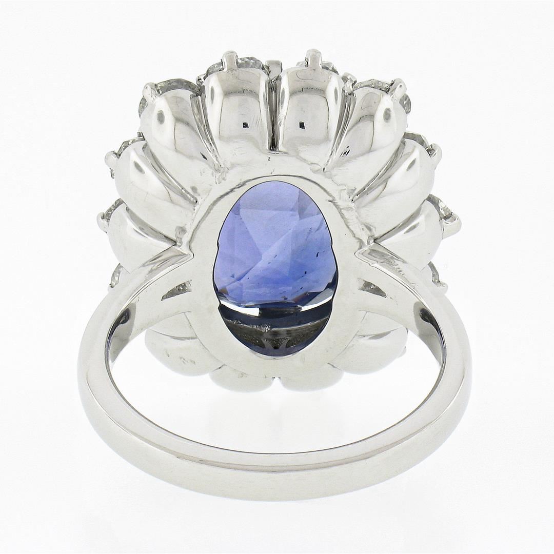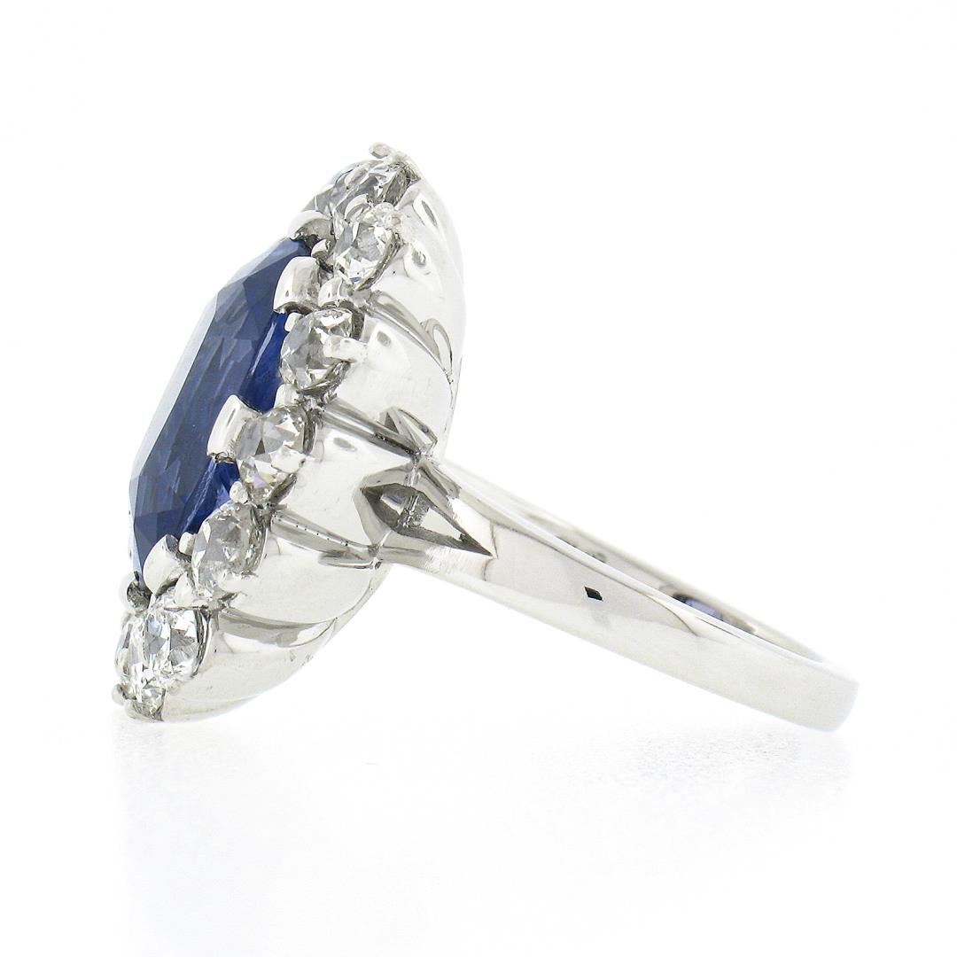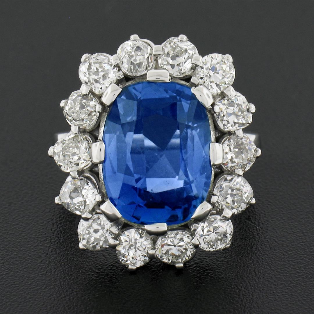 A new platinum large ring, with 1 AGL graded old cut natural sapphire (NO HEAT - 8.40ct), & a halo of 14 old mine 7 old european cut natural diamonds (G/H - VS1/VS2 ; 2.82ctw). The ring is size 6.5, weighs a total of 15.61 grams, and measures 21.90mm wide. Comes with all original relevant certifications.