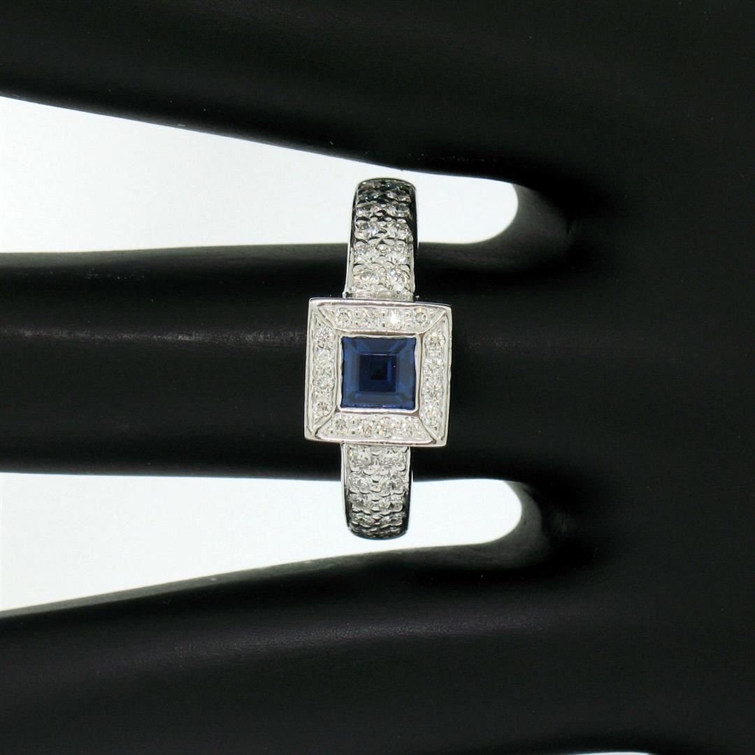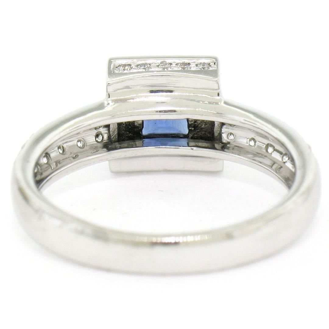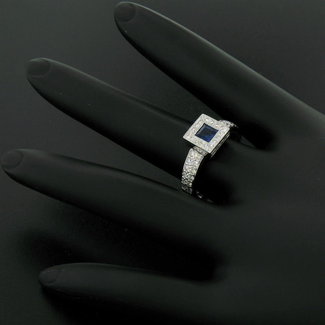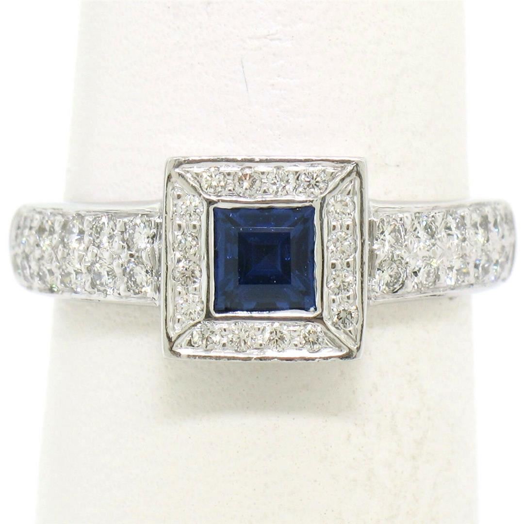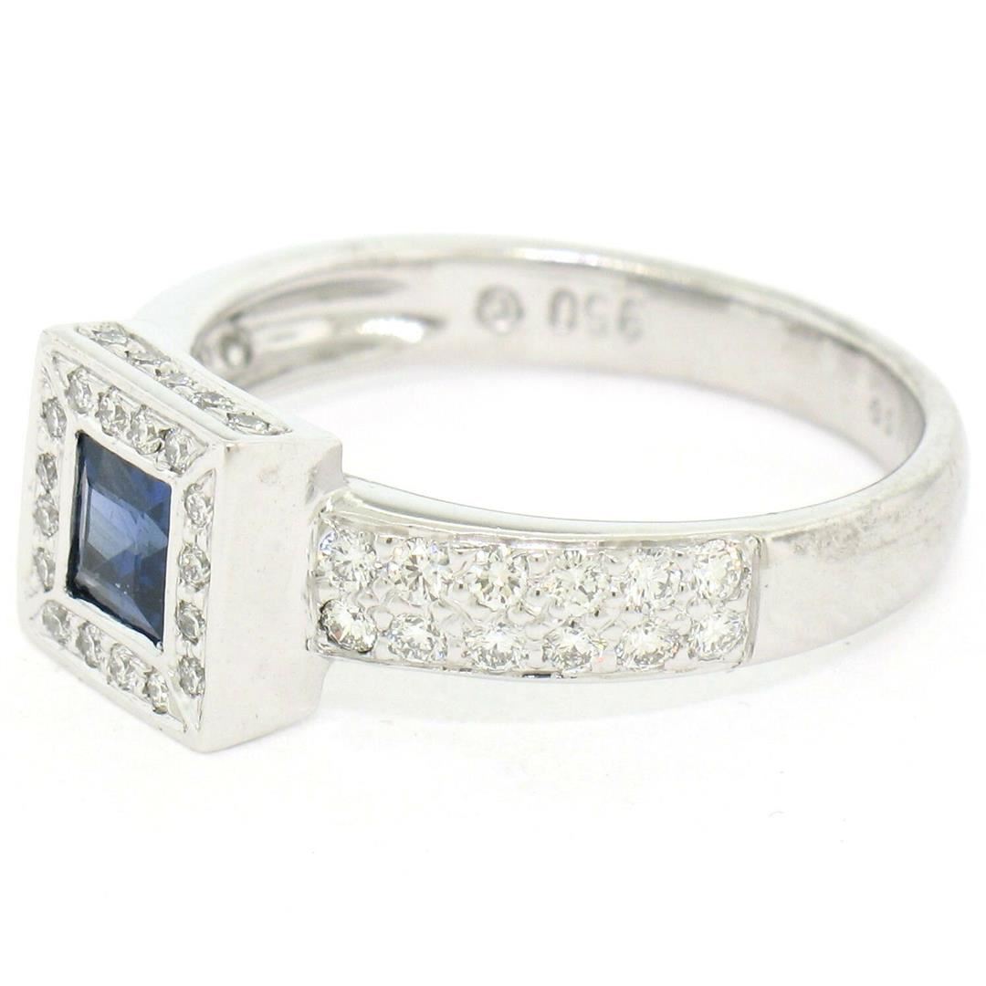 A new solid .950 platinum engagement ring featuring a bezel set square step cut sapphire accented by round brilliant cut diamonds (F/G - VS1). The ring is size 6.5, weighs a total of 6.77 grams, and measures 8.05mm wide.