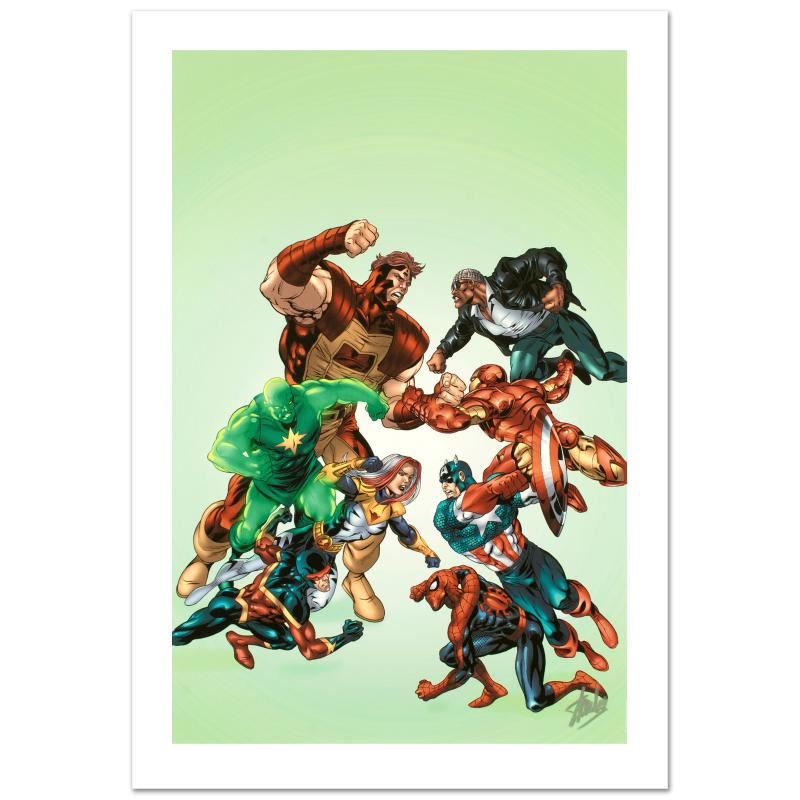 A piece of comic book history, this limited edition, from original art by Tom Grummett, depicts an action packed scene featuring the Avengers. While working for Marvel, Tom Grummett was the penciller on the Thunderbolts series and also co-created the X-Men Forever series. "New Thunderbolts #3" is a limited edition giclee on canvas by Tom Grummett presented by Marvel Comics, numbered and hand signed by the great Stan Lee! Includes Certificate of Authenticity! Measures approx. 18" x 27" (image).