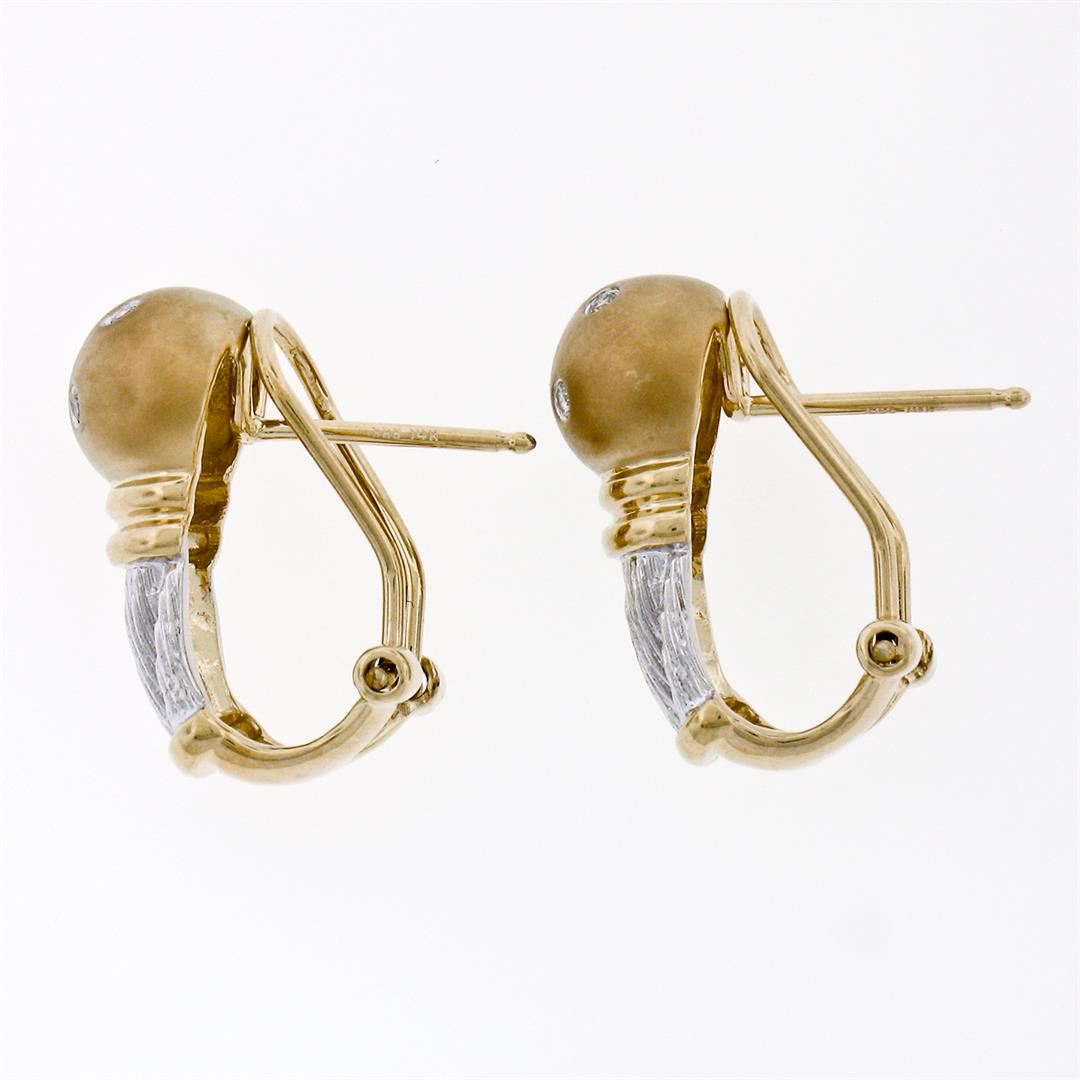 New Unique 14K TT Gold .20ctw Round Diamond Textured Brushed Omega Back Earrings. Please see photos and description for all available information. a new solid 14k yellow and white gold brushed earrings, with 10 round brilliant cut natural diamonds (G/H- VS2; 0.20ctw). The earrings measure approximately 20.0x8.85mm and weigh a total of 6.43 grams.