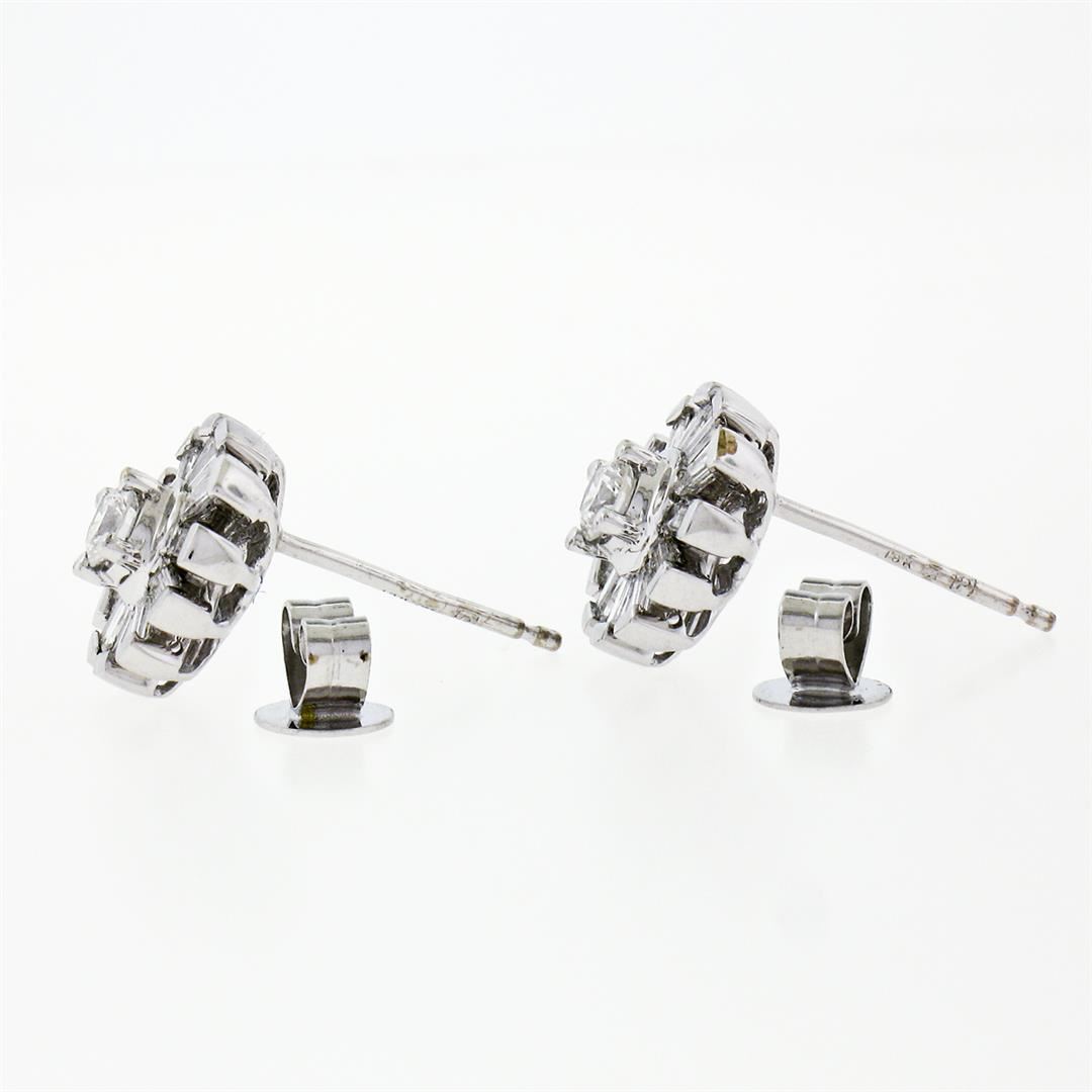 A New pair of solid 18k white gold snowflake stud earrings, with 2 round brilliant cut natural diamonds (F/G - VS2 ; 0.24ctw), surrounded with 24 baguette cut natural diamonds (F/G - VS1 ; 0.78ctw). The earrings measure approximately 10.10mm in diameter a
