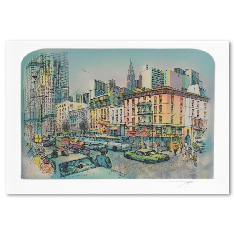 "New York" is a limited edition lithograph on paper by Rolf Rafflewski, numbered and hand signed by the artist. Includes Letter of Authenticity. Measures approx. 22" x 15" (border), 19" x 12.5" (image). There may be minor imperfections but the piece is in overall good condition.