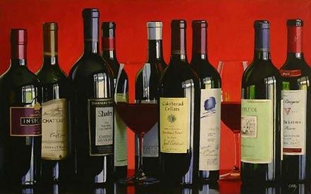 Thomas Stiltz collection of terrific California Red wines. A 20x32" signed limited edition stretched giclee on canvas. COA.