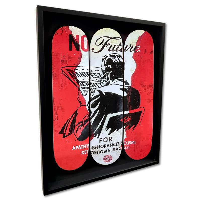 "No Future" is a limited edition skateboard triptych by Shepard Fairey, bearing the plate signature of the artist inverso. This triptych comes custom framed. Includes Letter of Authenticity. Measures approx. 37" x 30" x 3" (frame), 32" x 24" (skateboards).